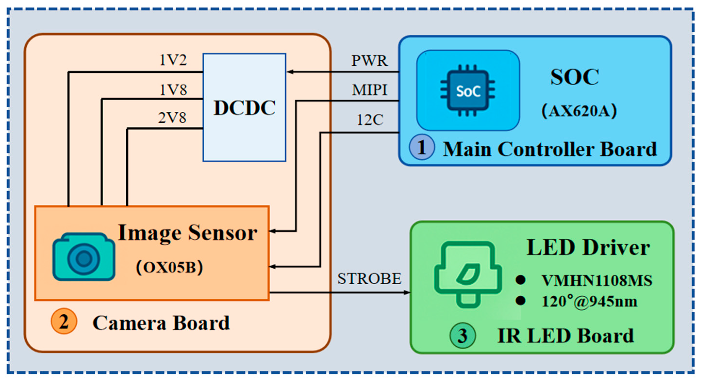 The hardware terminal of the Driver Fatigue Monitoring System (DFMS) primarily consists of three main components: the main control board, the camera module, and the infrared supplementary light. The main control board employs a highly integrated, computationally powerful AI System-on-Chip (SoC), with the AX620A chip at its core. The camera module is equipped with an image sensor based on the OV05B1S chip, enabling real-time capture of driver images and transmission to the main control board for data processing. The infrared supplementary light (IR LED) ensures stable acquisition of high-quality driver facial images under various lighting conditions. A schematic diagram of the hardware terminal is shown in