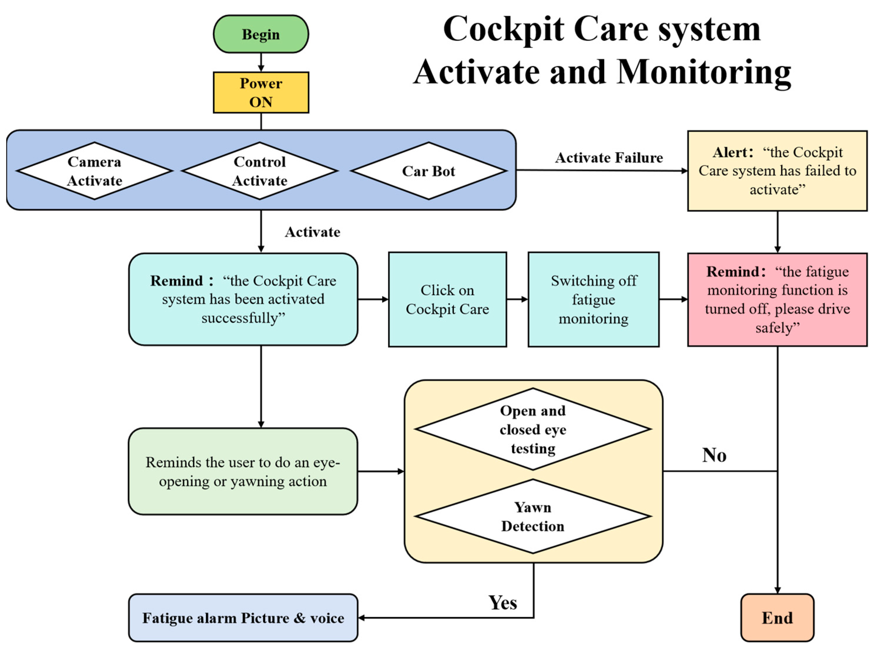 Figure 3. Upon vehicle startup and power-on, the system synchronously activates the camera (Camera Activate), the main control module (Control Activate), and the in-vehicle system (Car Bot). Once all three components are successfully activated, the system notifies the driver via the interface with the message, “The Cockpit Care system has been activated successfully,” and enters continuous monitoring mode.