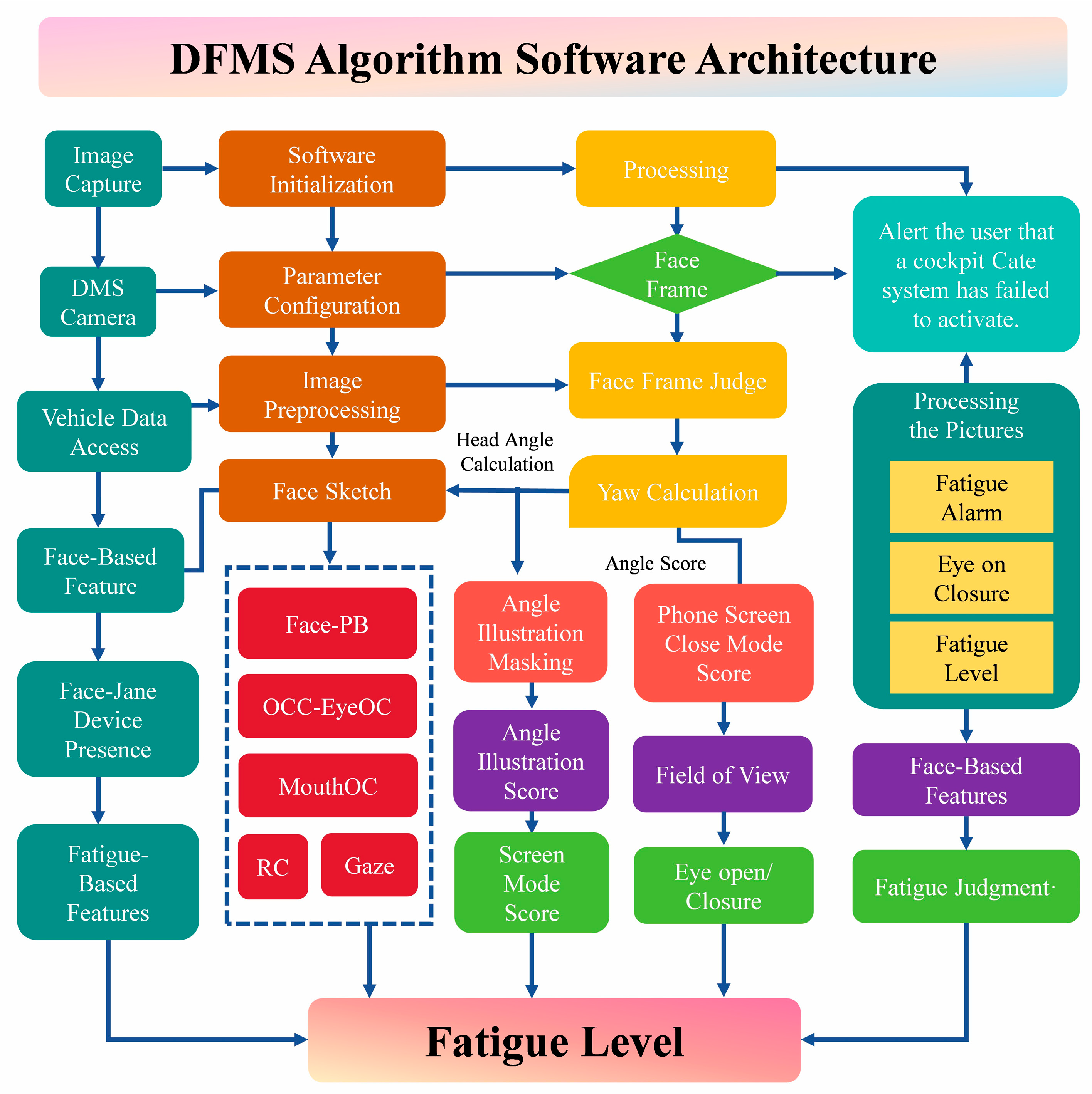 Figure 4, the DFMS algorithmic software architecture can be interpreted as a sequence of four functional stages. First, image acquisition and preprocessing modules initialize the system, configure parameters, and generate normalized facial data from raw RGB and infrared inputs. Second, face frame validation and posture-related computations (e.g., face frame judgment, head angle calculation, and yaw estimation) determine whether subsequent feature extraction is activated. Third, a set of core perception submodules—highlighted in the dashed block in