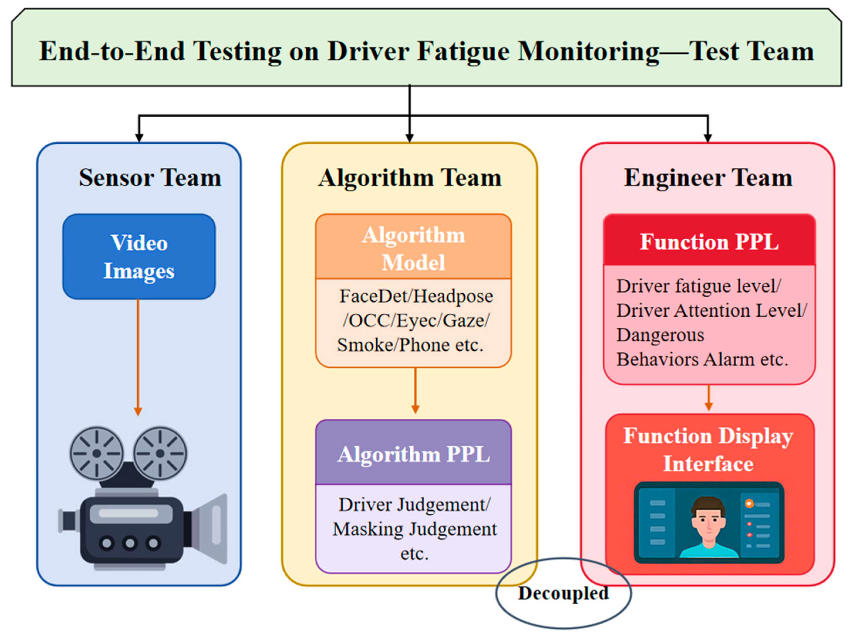 Figure 5 provides an overview of the end-to-end testing framework, showing the sequential data flow between the Sensor, Algorithm, Engineering, and Testing Teams. The Sensor Team captures and transmits raw video data, the Algorithm Team processes it using detection and recognition models, the Engineering Team integrates the processed outputs into system functions, and the Testing Team evaluates the complete system through functional performance and user experience assessments. This structured flow reflects the collaborative yet modular nature of the approach, ensuring each team focuses on its specific role while maintaining overall system coherence.