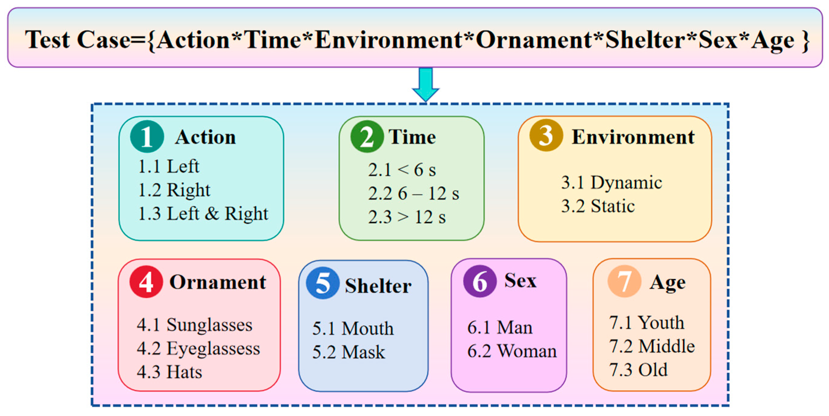 Beyond computational aspects, the choice of these algorithms was guided by their complementary strengths: Cartesian product provides exhaustive coverage for simulation datasets, orthogonal analysis achieves balanced coverage with fewer cases, and pairwise analysis minimizes test size for on-road validation. Moreover, scenario design incorporated demographic and environmental diversity (e.g., gender, age, lighting, accessories) to enhance representativeness. Sample sizes were determined to balance statistical coverage with feasibility, ensuring rigorous yet practical validation.