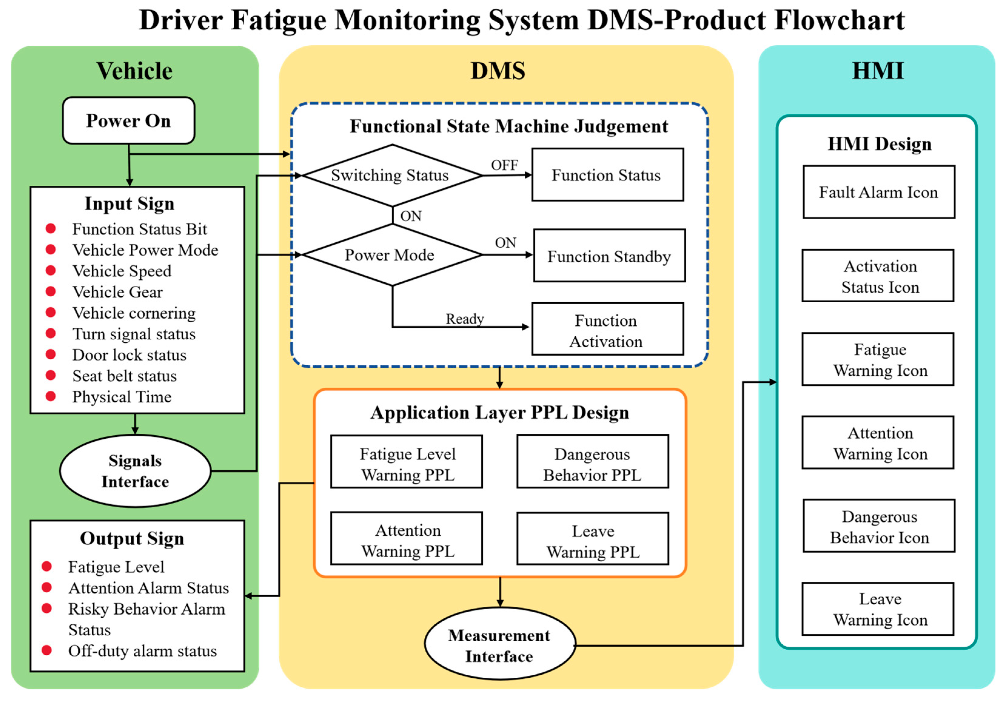 In the Vehicle Module, the “Power On” condition serves as the test initiation trigger, simulating a real ignition scenario. A unified signal interface collects multidimensional raw signals, including functional status bits, vehicle power mode, vehicle speed, gear position, steering status, turn signal status, door lock status, seatbelt status, and system physical time, which are input into the DFMS. The DFMS Core Processing Unit first determines the system’s operational phase using a functional state machine. Upon meeting switch-state transition and readiness conditions, the system sequentially enters standby, warm-up, and activation phases. Subsequently, it employs four application-layer perception–processing–logic (PPL) modules, namely Fatigue Level Warning, Attention Warning, Dangerous Behavior Warning, and Leave Warning. Here, PPL refers to a rule-based application-layer processing stage that integrates perception outputs with vehicle state information to generate driver state judgments and warning decisions.