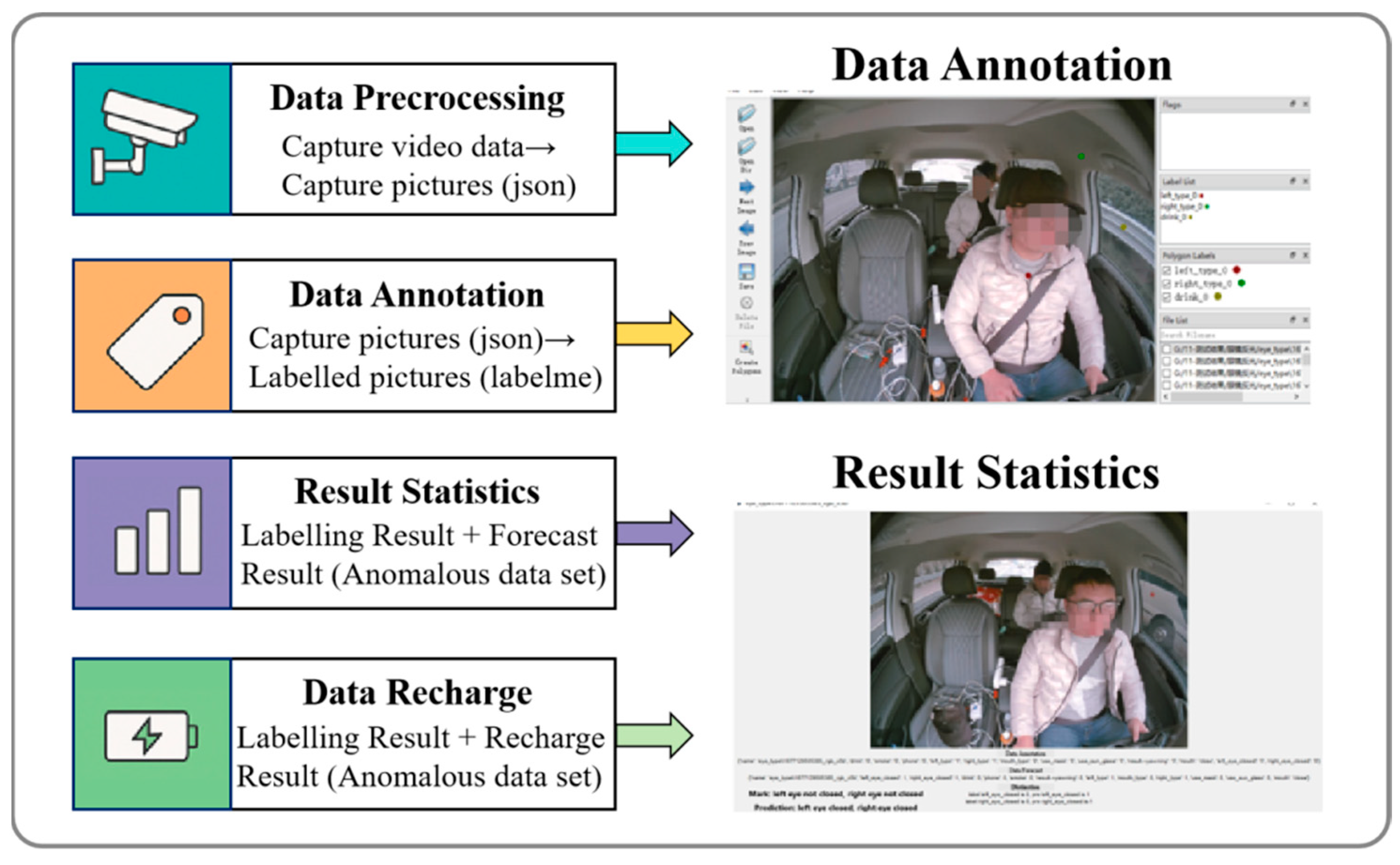 Data Annotation: Preprocessed video data are manually or semi-automatically annotated to generate corresponding images and JSON files. Annotations include driver facial features, behavioral states (e.g., eye closure, yawning, phone use), and environmental factors (e.g., lighting variations, occlusions).