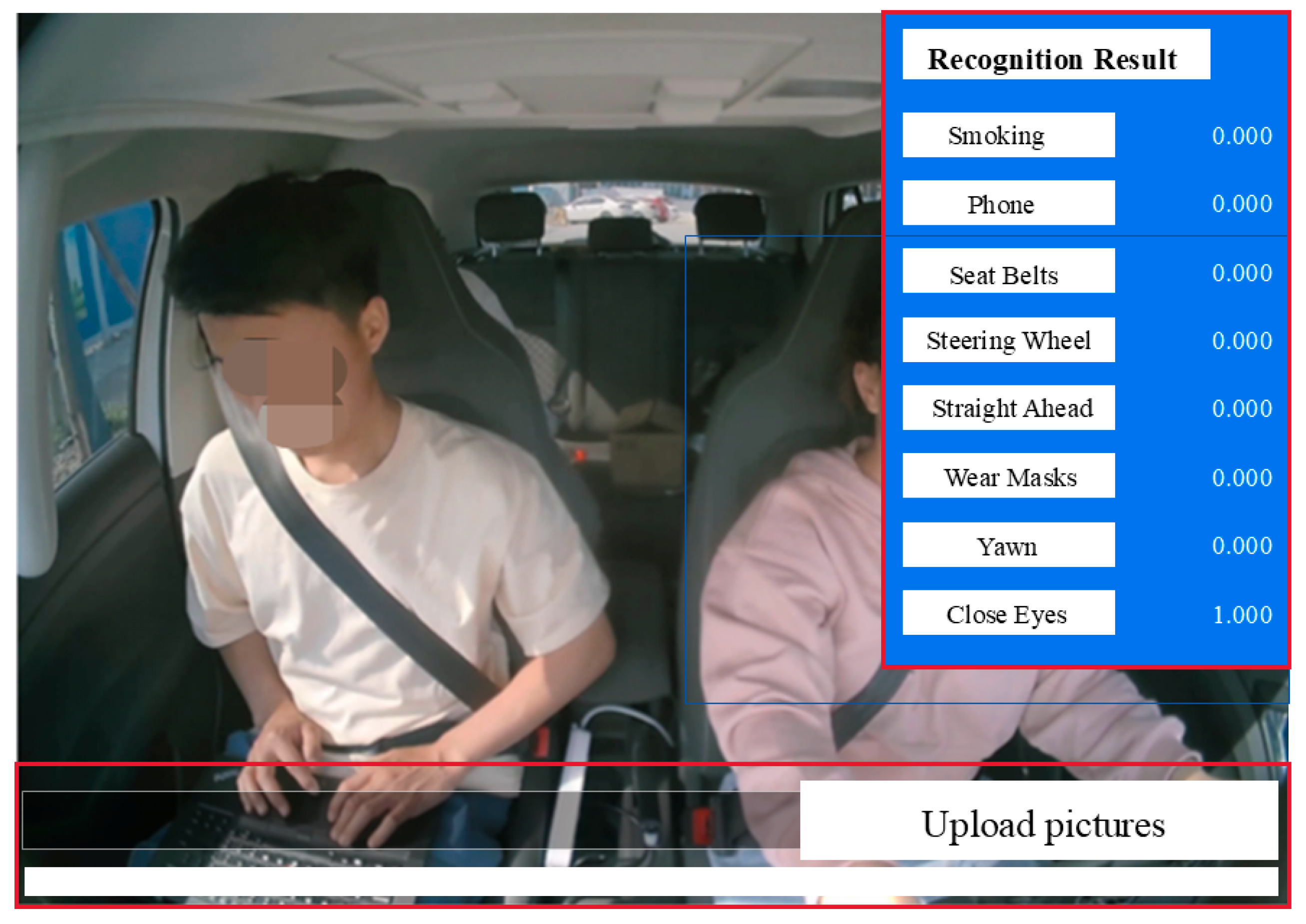 The evaluation dataset consisted of images collected from young Asian male and female subjects. Identical driver behavior images were uploaded to both the commercial platform and the proposed DFMS, and the resulting recognition outputs were analyzed under the same testing conditions. The comparison results are summarized in