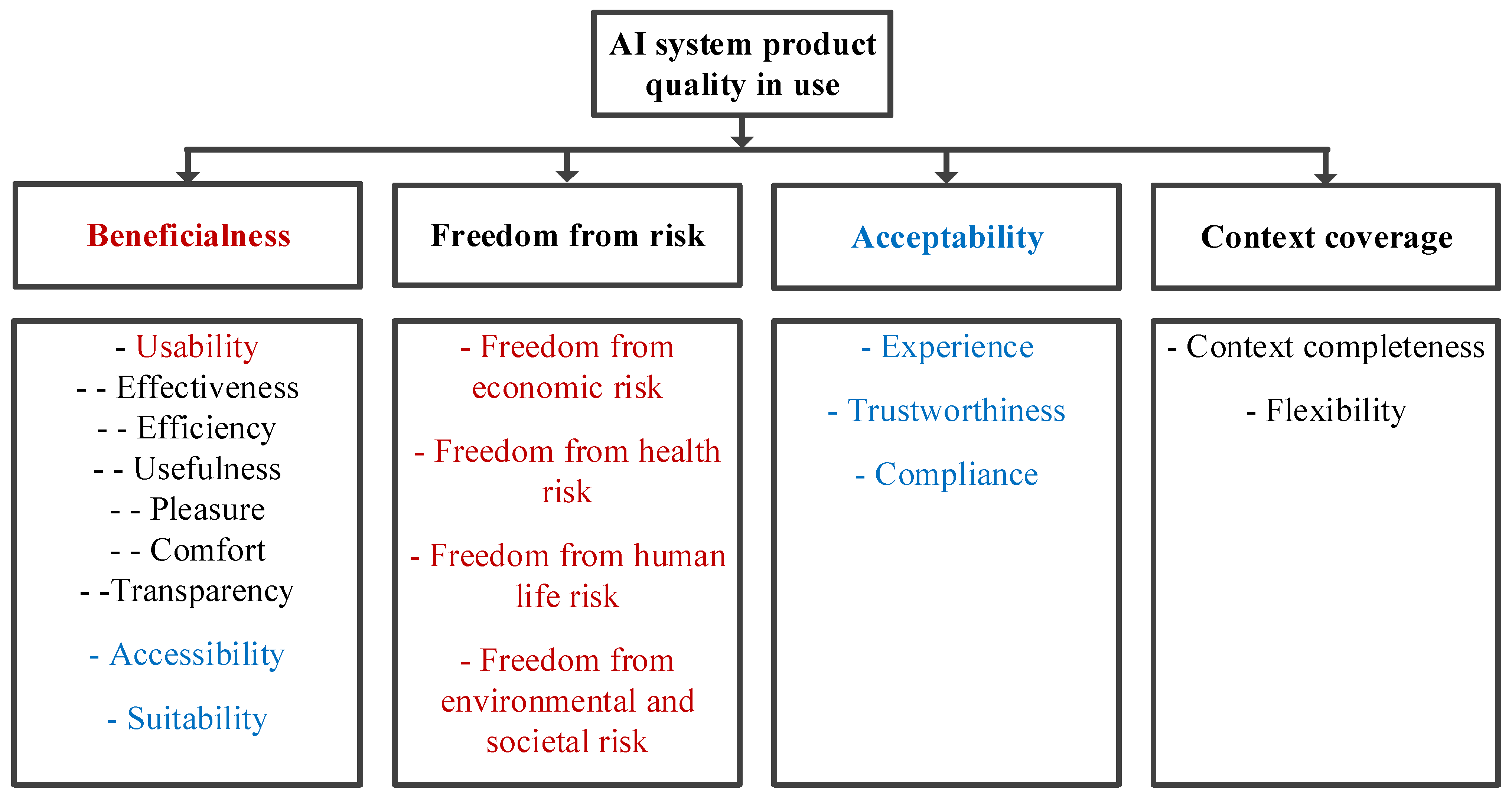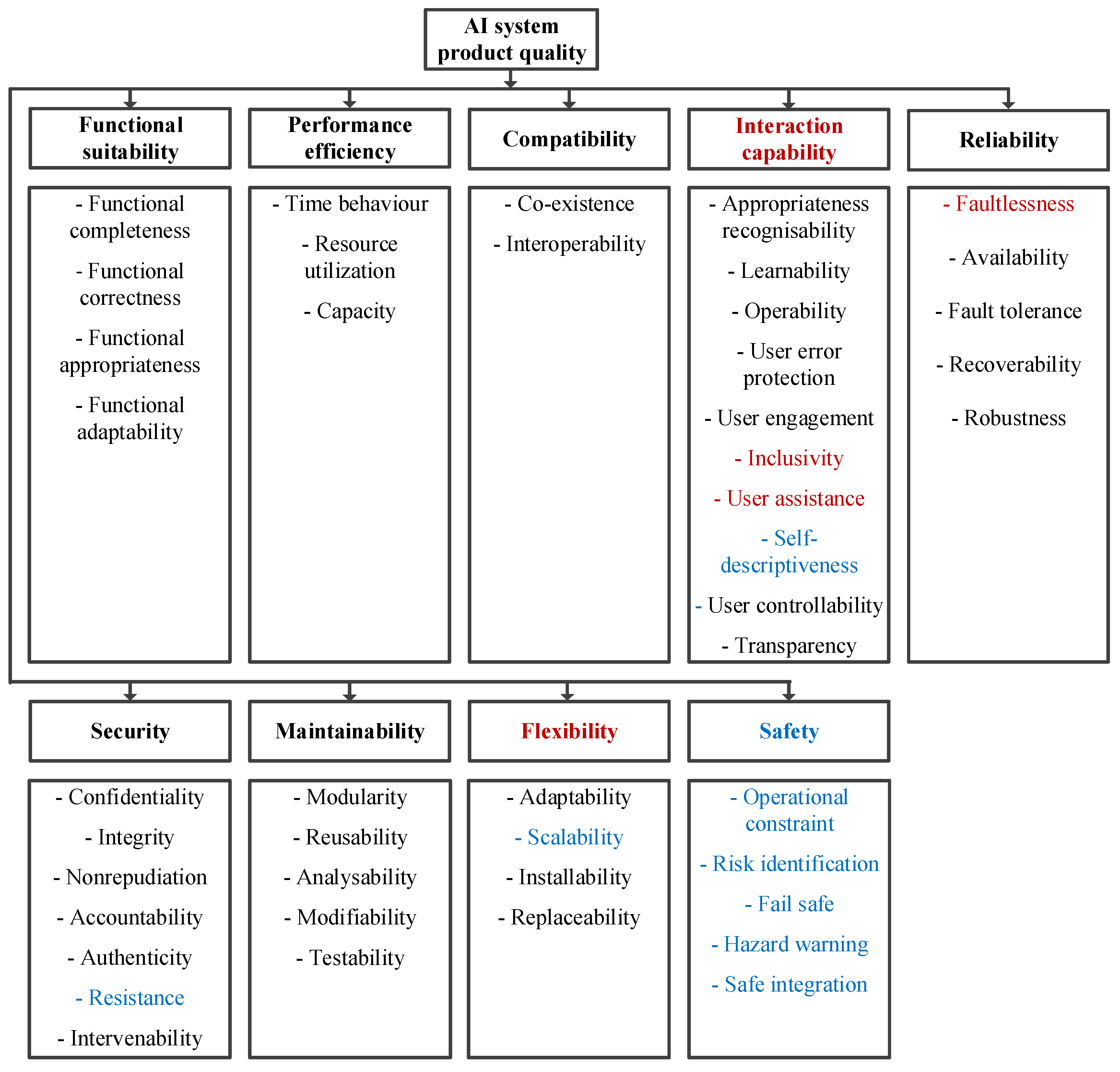- For quality (sub)characteristics carried over unchanged from the ISO/IEC 25010 software product quality model into the ISO/IEC 25059 AI system quality model, the metrics defined in ISO/IEC 25023 may be used, as mentioned in the guidelines for the evaluation of AI systems [50]. The ISO/IEC 25023 standard is currently under revision and contains a set of quality metrics for each (sub)characteristic, as well as recommendations for their application to software products and systems. The applicability of these metrics to AI systems is not discussed in this paper.