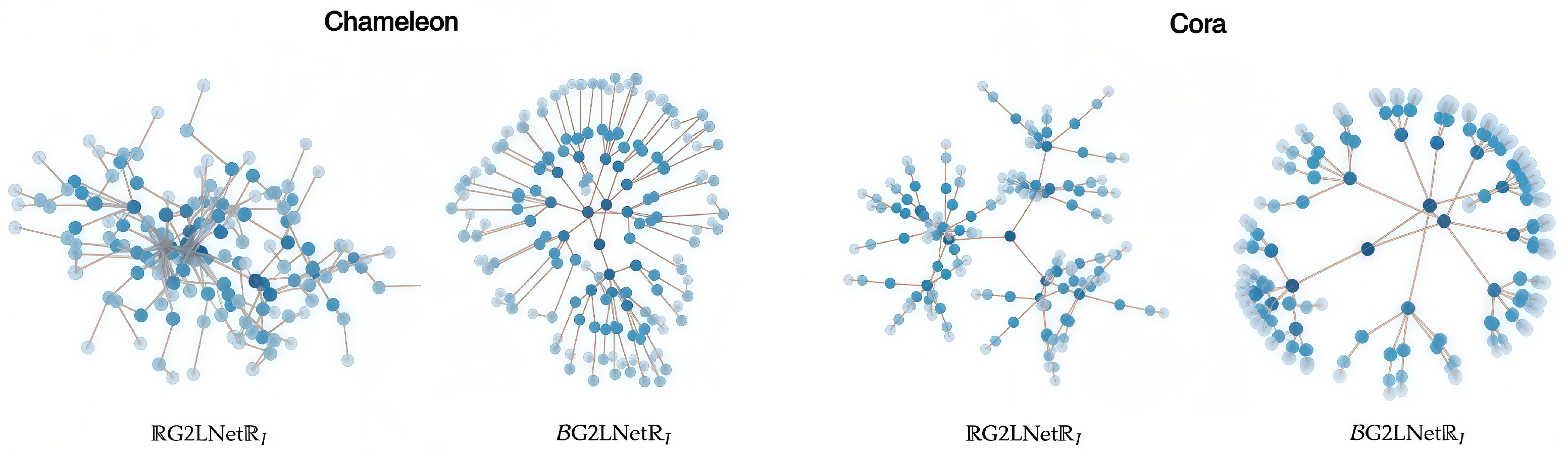 From this perspective, the observed graph can be treated as an imperfect measurement of latent relations, while node representations provide an alternative source of evidence for constructing communication patterns. If node signals admit an underlying geometric organization, then distances or inner products in an appropriate space can serve as a proxy for dependency strength and yield a topology that is more aligned with task semantics. Moreover, allowing multiple geometries provides additional flexibility: Euclidean spaces are naturally suited for locally smooth structures, while hyperbolic spaces can better represent uneven, hierarchical, or tree-like organizations that may arise in relational data. This motivates a unified framework that learns a geometry-aware topology from representations, and explicitly regulates the influence of the given adjacency rather than assuming it is fully reliable.