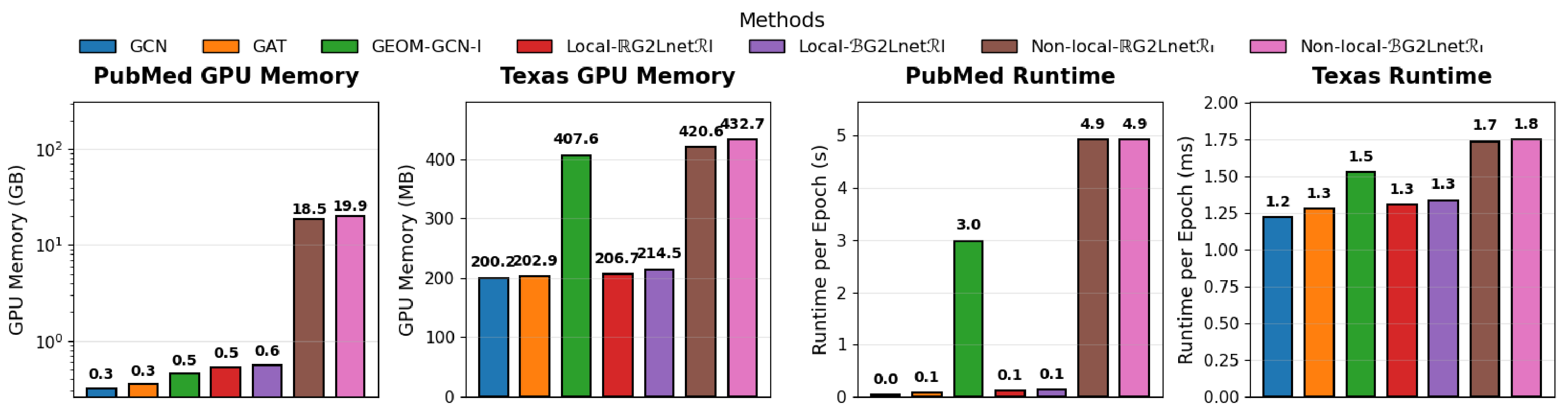 We compare G2LNet with representative local and non-local methods, focusing on the additional cost of relation computation. Let be the number of nodes, the number of observed edges, and f the embedding dimension.