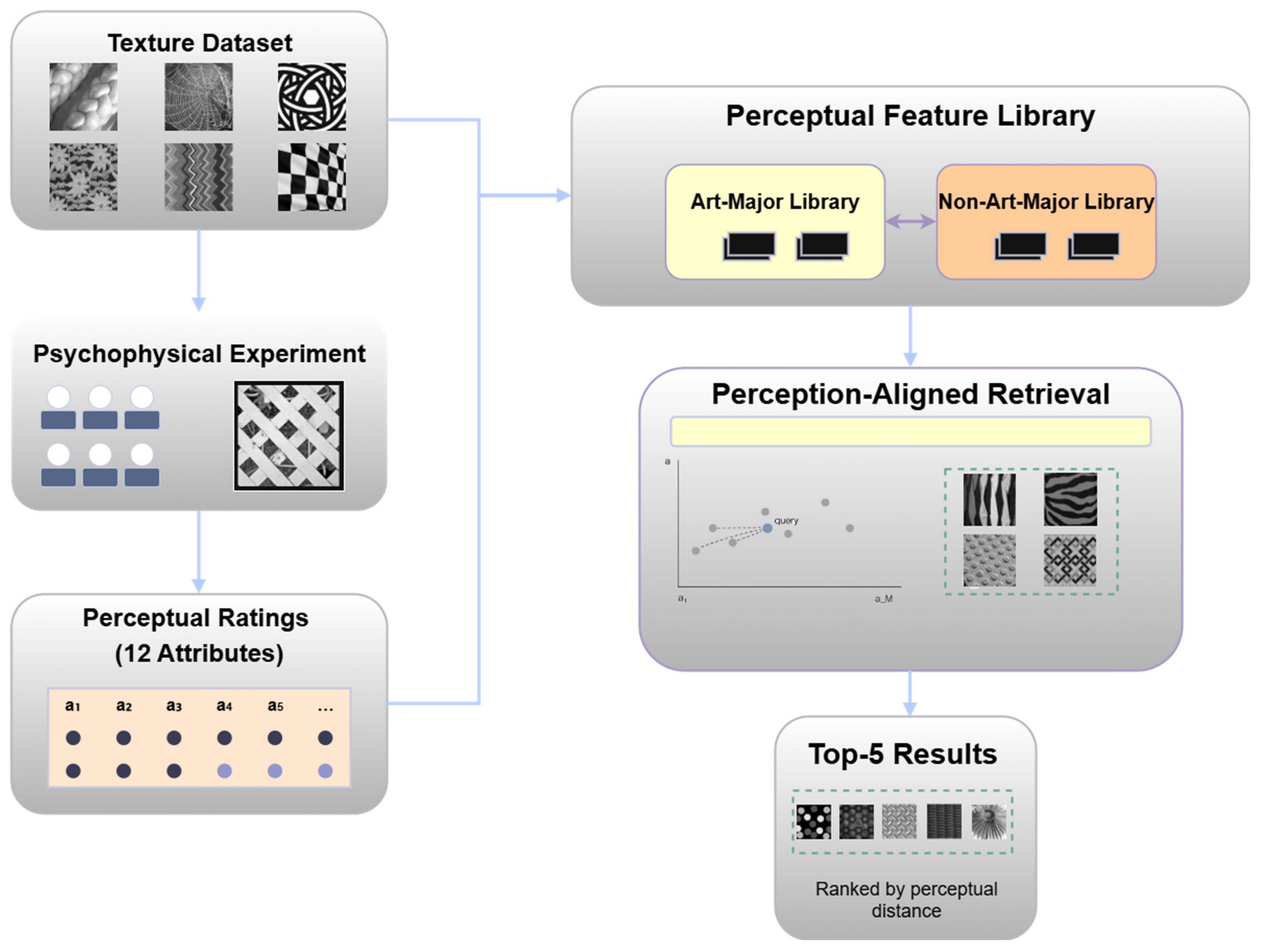 Figure 1. The framework consists of two main stages: perceptual feature construction and perception-aligned retrieval. Texture images are first evaluated through psychophysical experiments to obtain aggregated perceptual feature vectors, and separate perceptual feature libraries are constructed for art-major and non-art-major observer groups. Given a user-defined perceptual description as the query, retrieval is performed directly in the perceptual feature space by measuring perceptual distances, and the Top-K most perceptually similar textures are returned.