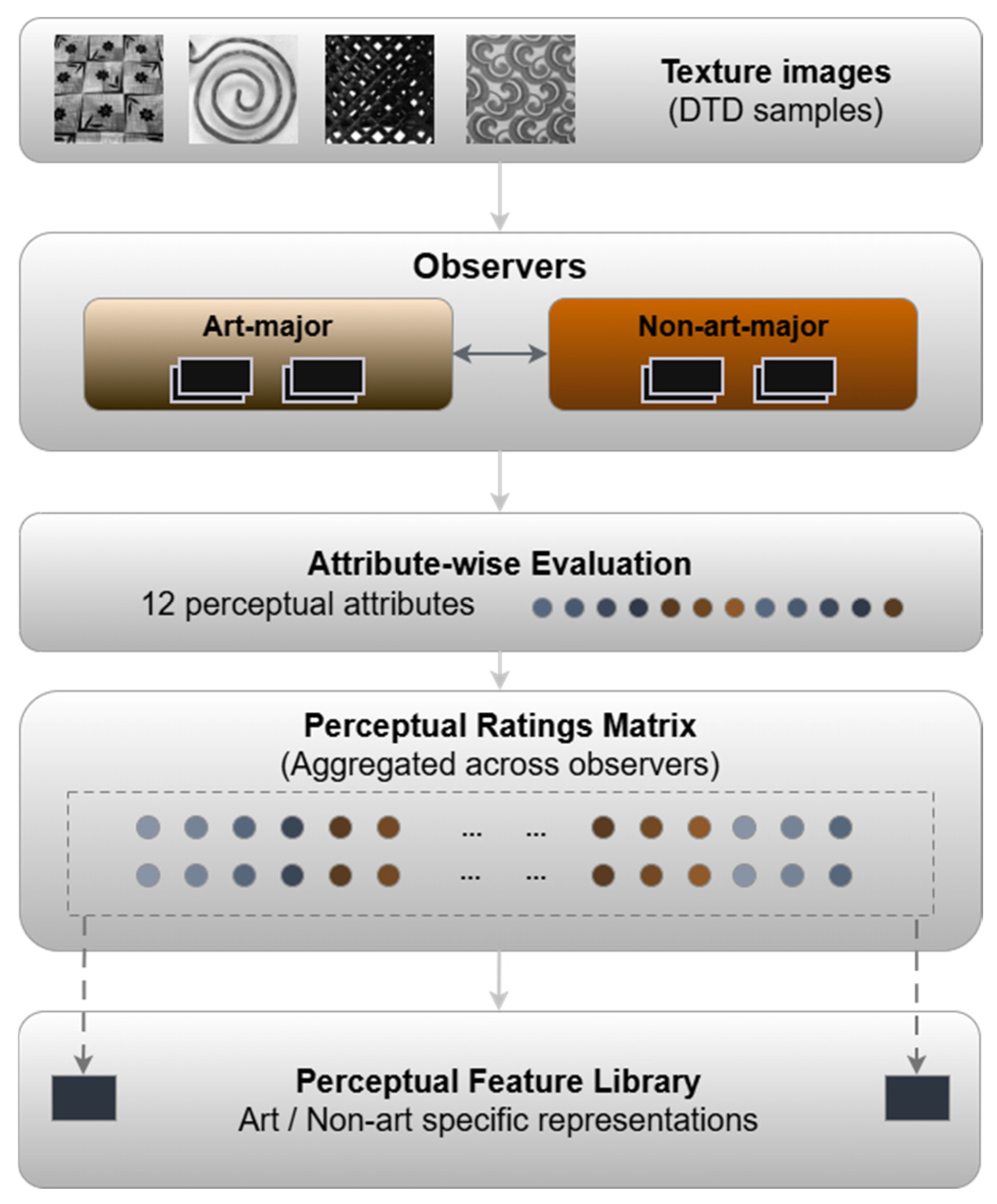 Figure 3 illustrates the overall procedure of the psychophysical experiment designed for perceptual attribute evaluation. Texture images are presented to observers under controlled laboratory conditions, where participants from art-major and non-art-major groups perform attribute-wise evaluation using a predefined set of perceptual attributes. The collected subjective ratings are aggregated across observers to form perceptual feature representations, which serve as the basis for constructing the perceptual feature library.