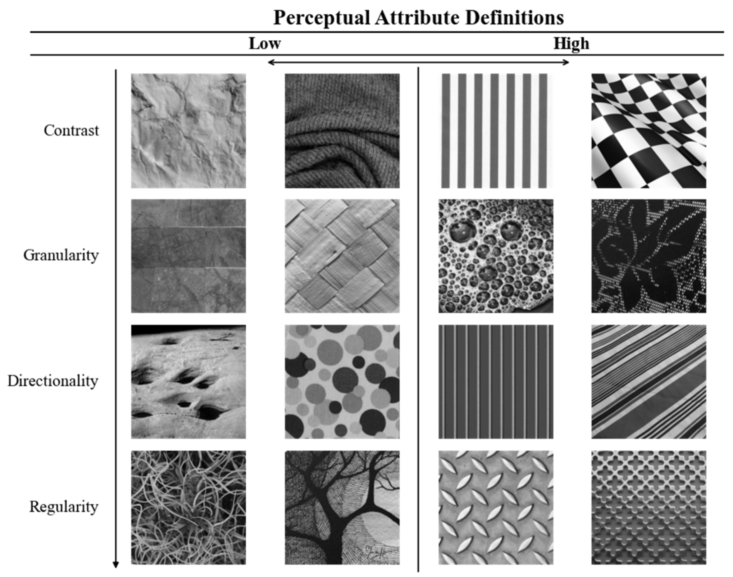 5]. In texture-related scenarios, humans tend to describe and distinguish textures using perceptual attributes such as roughness, directionality, and contrast. Classic perceptual studies have shown that texture perception can be characterized along a set of perceptually meaningful dimensions [