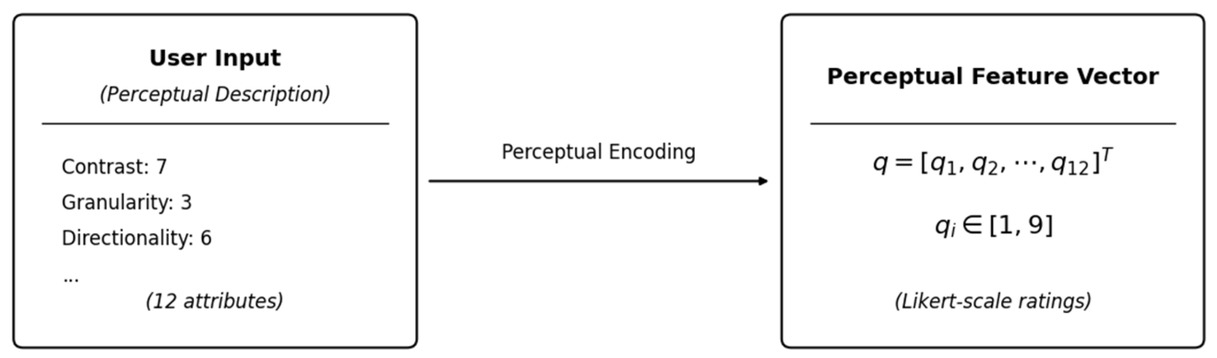 Based on a review of relevant literature and expert consultation, a set of perceptual attributes is defined to characterize texture appearance using commonly adopted descriptors in texture perception studies. These attributes are selected to reflect both local and global perceptual properties of textures, including but not limited to contrast, repetitiveness, granularity, and feature density. Each attribute is treated as an independent perceptual dimension to facilitate explicit perceptual representation.