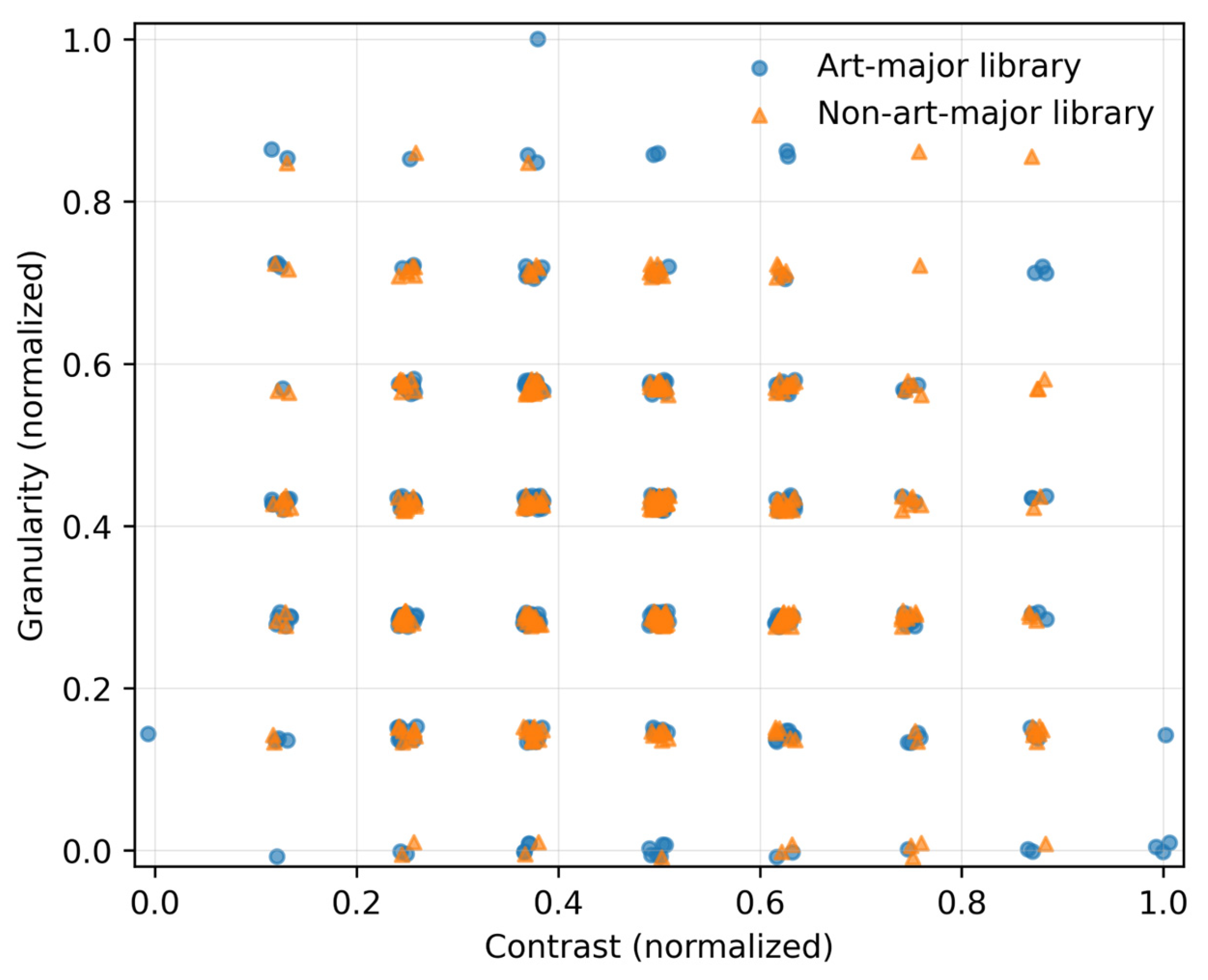 A total of 62 participants were recruited for the perceptual evaluation. All participants were university students aged between 18 and 26 years, including 29 males and 33 females, forming a controlled observer group under standardized laboratory conditions. Their majors encompassed fields such as Computer Science, Law, and Arts. Participants are recruited and divided into two groups according to their educational background: an art-major group and a non-art-major group. This grouping strategy is motivated by previous findings that visual training and artistic experience may influence sensitivity to texture-related perceptual attributes. All participants re-port normal or corrected-to-normal vision and have no known visual or neurological disorders.