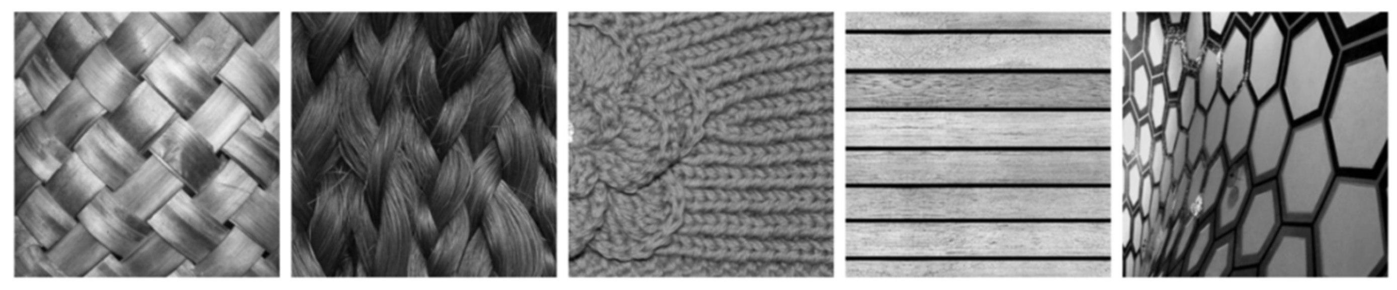The experiments in this study are conducted using texture images selected from the Describable Textures Dataset (DTD), which contains a diverse collection of real-world texture images covering a wide range of material categories and visual appearances. A total of 300 texture images were selected from the DTD for perceptual evaluation, covering multiple material categories. The selection aimed to ensure perceptual diversity across attributes such as granularity, regularity, contrast, and directionality, rather than category balance. To ensure perceptual diversity and experimental reliability, texture samples are selected to represent variations in structural regularity, granularity, contrast, and directionality. All selected texture images are resized to a unified resolution and converted to grayscale when necessary to reduce potential color-related interference in perceptual evaluation. This design choice was made to isolate texture-related perceptual attributes and avoid confounding effects introduced by color variation, rather than to model color perception. Representative examples of the preprocessed grayscale texture images used for perceptual evaluation are shown in