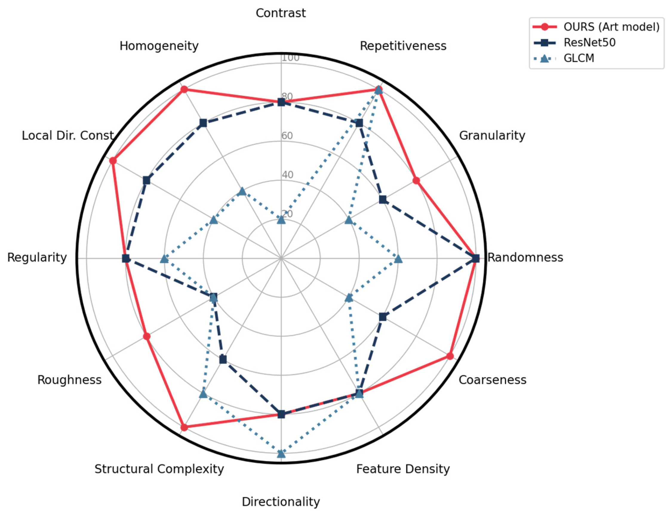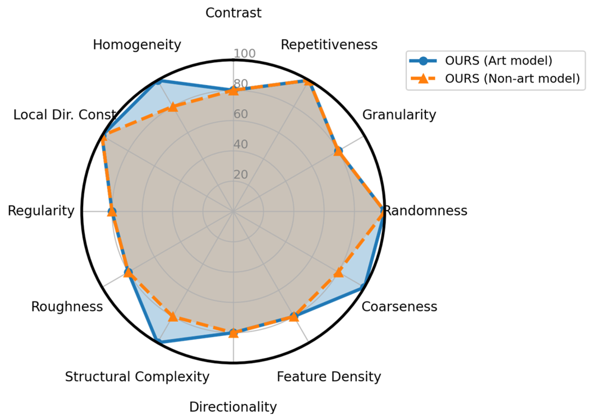 Figure 10 provides a focused comparison between the art-major and non-art-major perceptual feature libraries. Overall, the two perceptual feature libraries exhibit highly consistent patterns across most perceptual attributes, suggesting the existence of a shared perceptual baseline in texture perception. This consistency implies that the constructed perceptual feature space captures dominant perceptual tendencies that remain robust across user backgrounds.