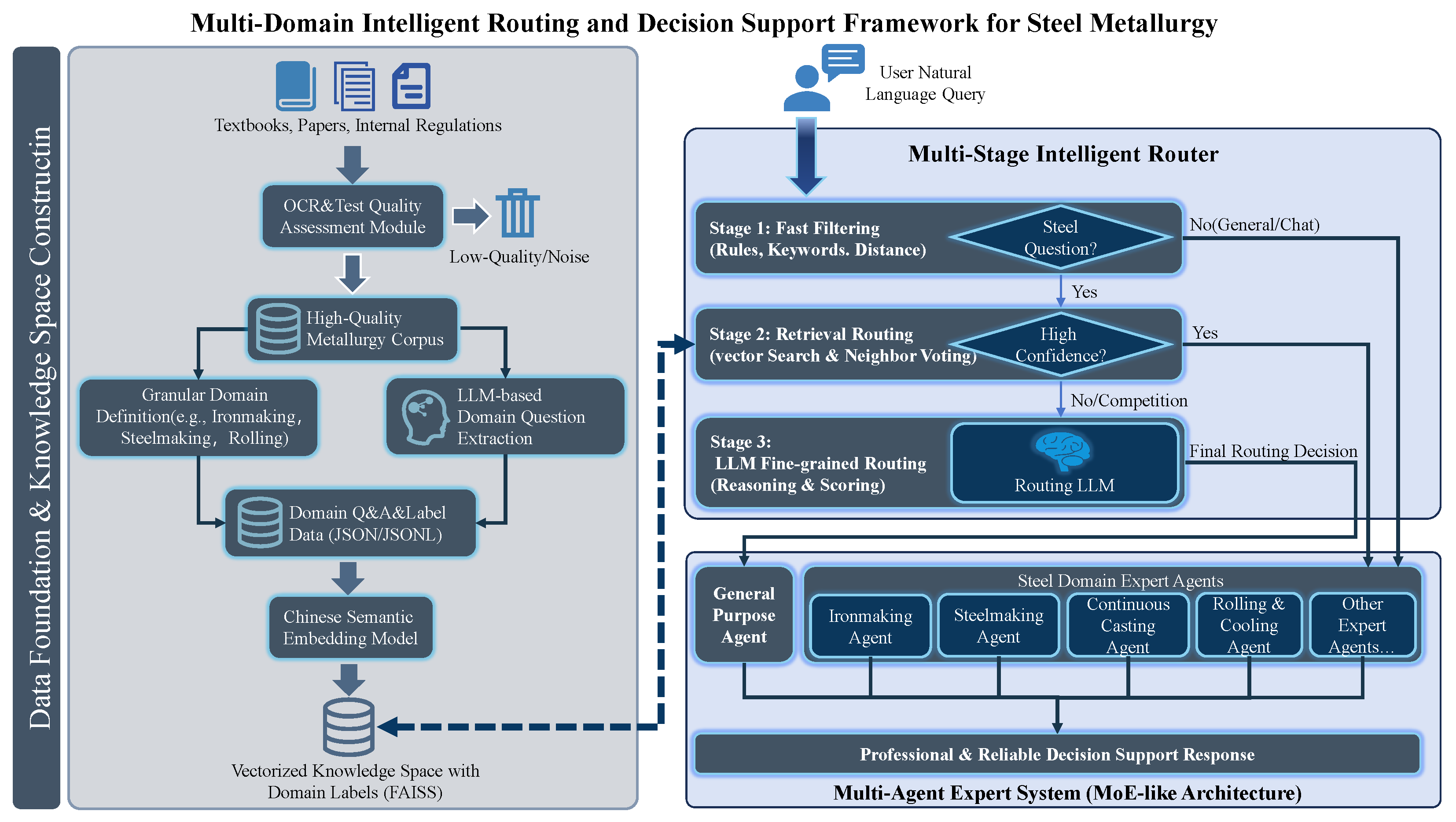 - We present an end-to-end workflow for building a steelmaking-oriented routing framework, covering OCR-based text preprocessing and quality scoring, fine-grained process-domain definitions, LLM-assisted query construction, and domain-labeled vector index construction, culminating in a practical multi-stage router design [9,10].