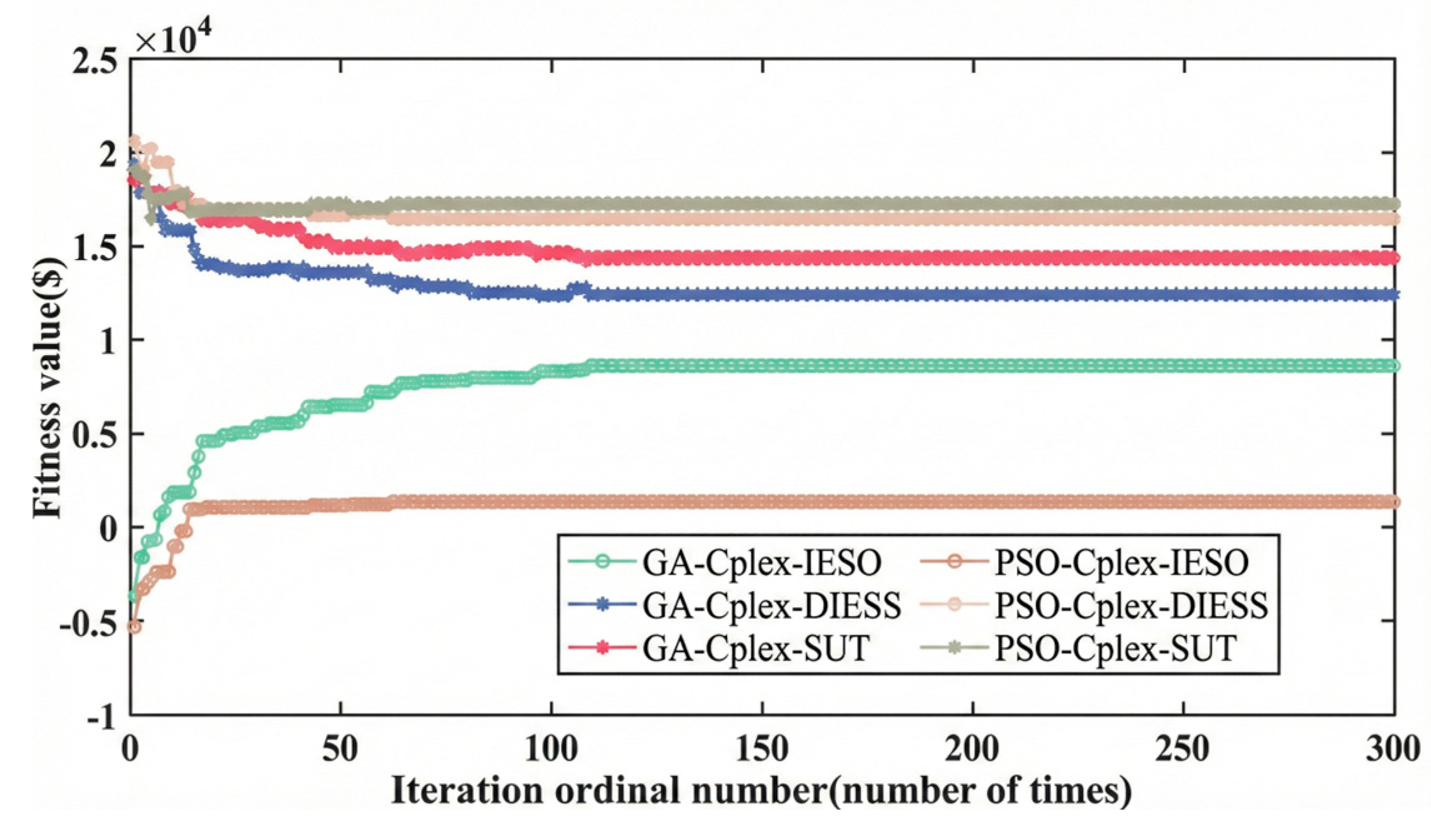 - Designing and validating a hybrid optimization framework that balances computational efficiency and solution quality. Given the complex mathematical features of the leader–follower game model—such as non-convexity, non-smoothness, and discrete variables—we have designed a GA–CPLEX hybrid solution scheme. By strategically partitioning the responsibilities between external pricing searches and internal linear programming, this framework effectively avoids the pitfalls of local optima common in pure heuristic algorithms while ensuring the uniqueness and rigor of the followers’ responses in each iteration. Comparative experiments across multiple scenarios demonstrate the superiority of this scheme in handling complex bi-level optimization problems.