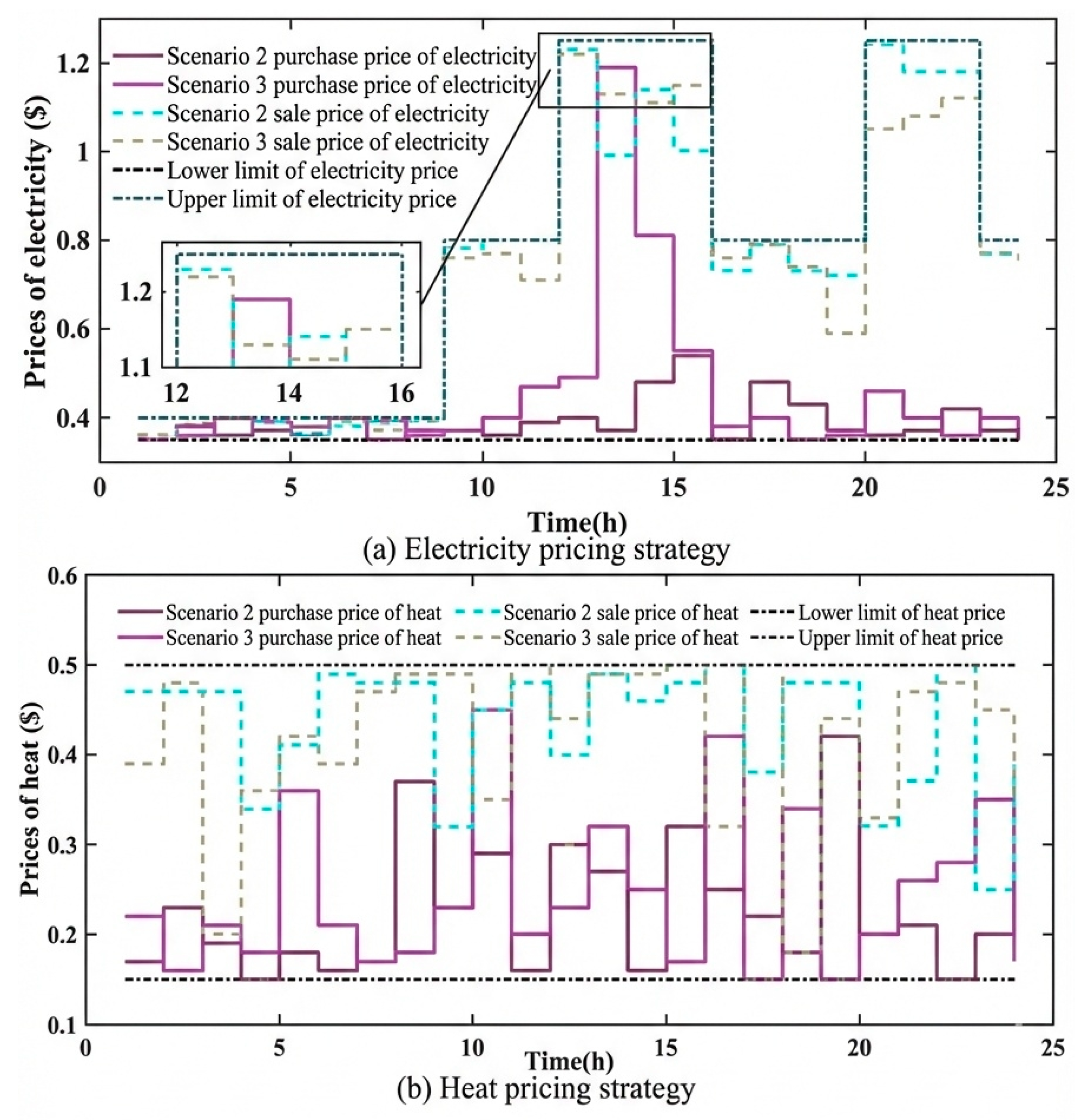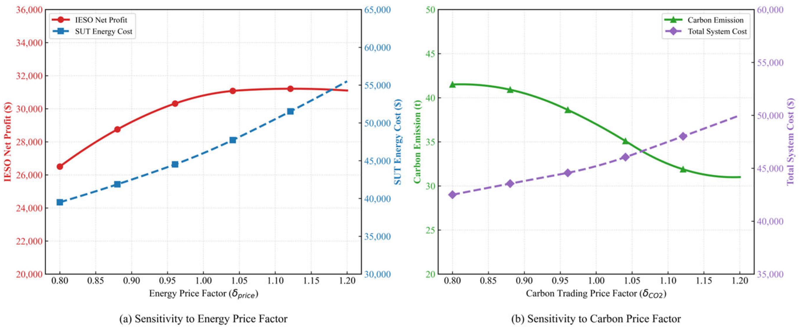 - The dynamic transmission law of carbon cost in a multi-agent game is revealed. Different from previous studies that attribute carbon emission responsibility to a single subject, we deeply discuss how the ladder-type carbon trading scheme transmits the cost signal of low-carbon transformation to the supply side and the demand side in real time through IESO’s pricing leverage. Through this model, we can observe how the carbon price signal induces DIESS and SUT to change their original operating inertia, which provides a new perspective for understanding the role of the carbon market in a multi-energy coupling environment.