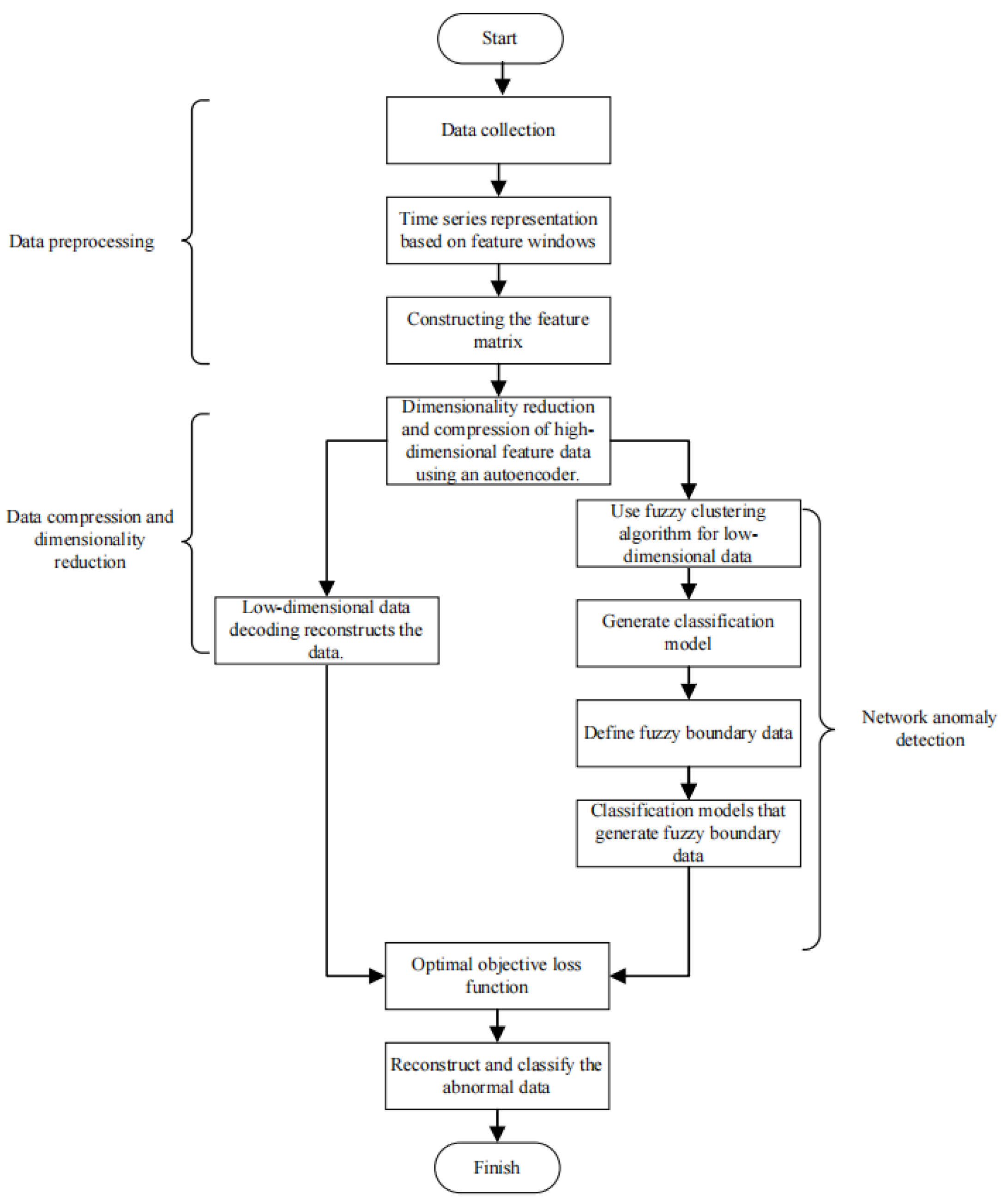 Figure 5 is a flowchart of network anomaly detection using the Fuzzy clustering analysis method. In low-dimensional data, cluster centers are calculated by minimizing the objective loss function, and the data are classified into normal and abnormal data based on the membership degree of the data calculated from the cluster centers. Among them, cluster centers represent the core features of normal and abnormal data, and membership degree indicates the probability value of each data point belonging to a certain cluster.