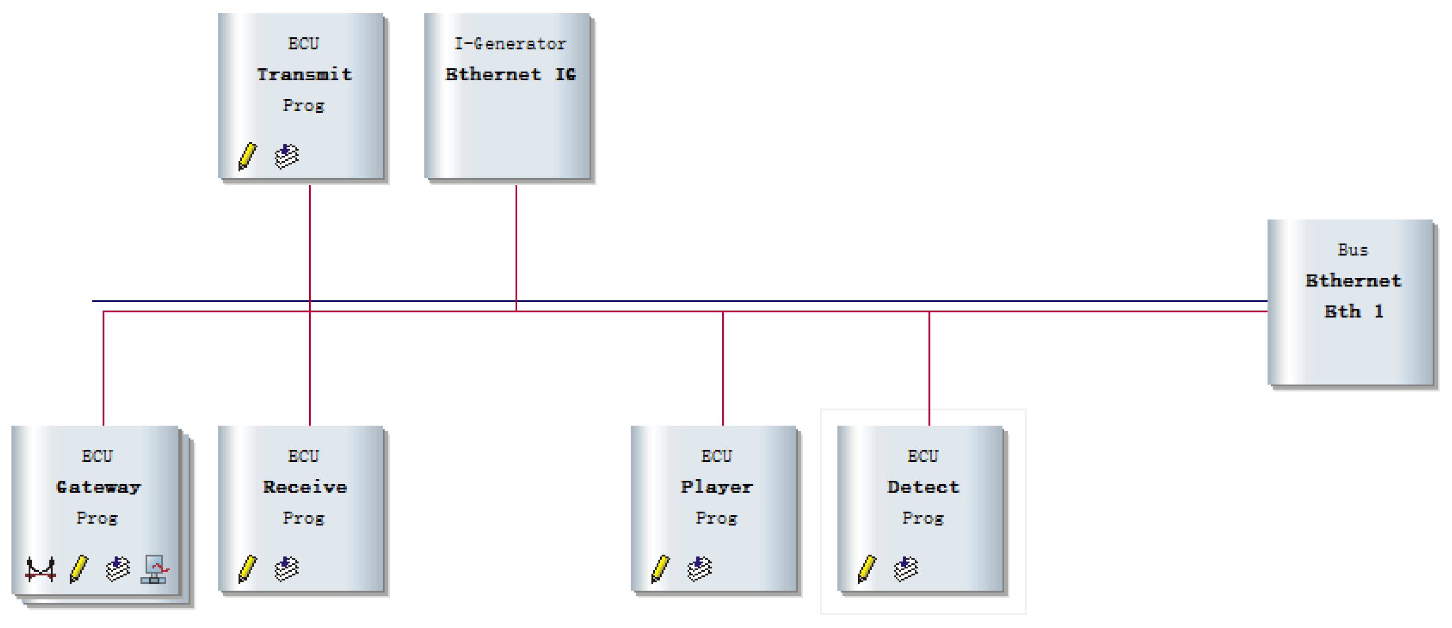 Figure 6. Among them, data is sent from the transmit node, abnormal data is simulated and injected in the Ethernet IG node, the Gateway node realizes data transmission between different buses, data is received in the receive node, multimedia data is played in the Player node, and abnormal data is detected in the Detected node. All of the above communication nodes are linked together via Ethernet Bus (Eth 1).