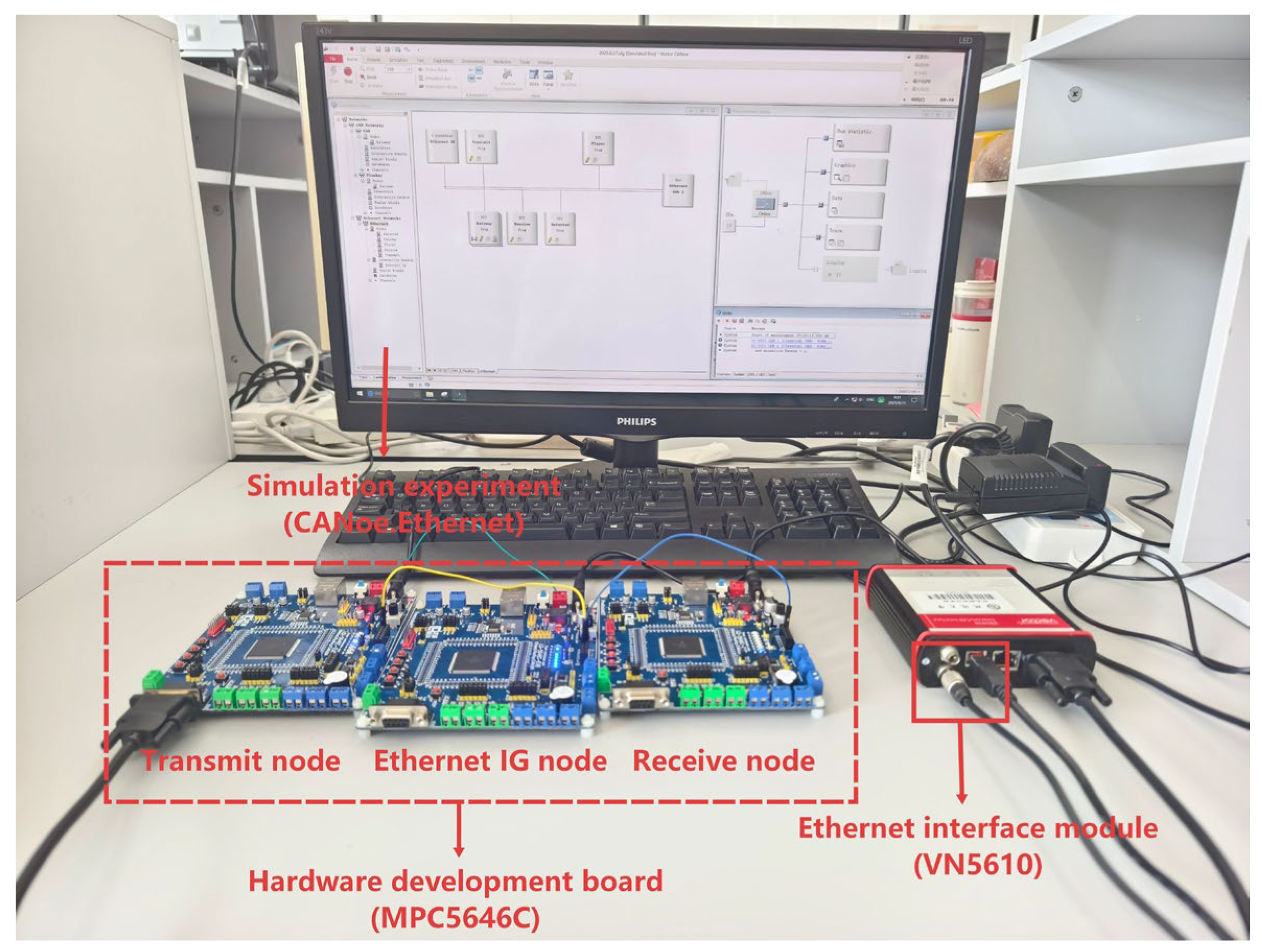 Figure 7. Among them, three MPC5646C hardware development boards for In-Vehicle Ethernet implement the Transmit node, Ethernet IG node, and Receive node. The CANoe.Ethernet system on the PC has a Gateway node, a Player node, and a Detected node. The VN5610 hardware features an Ethernet communication interface.