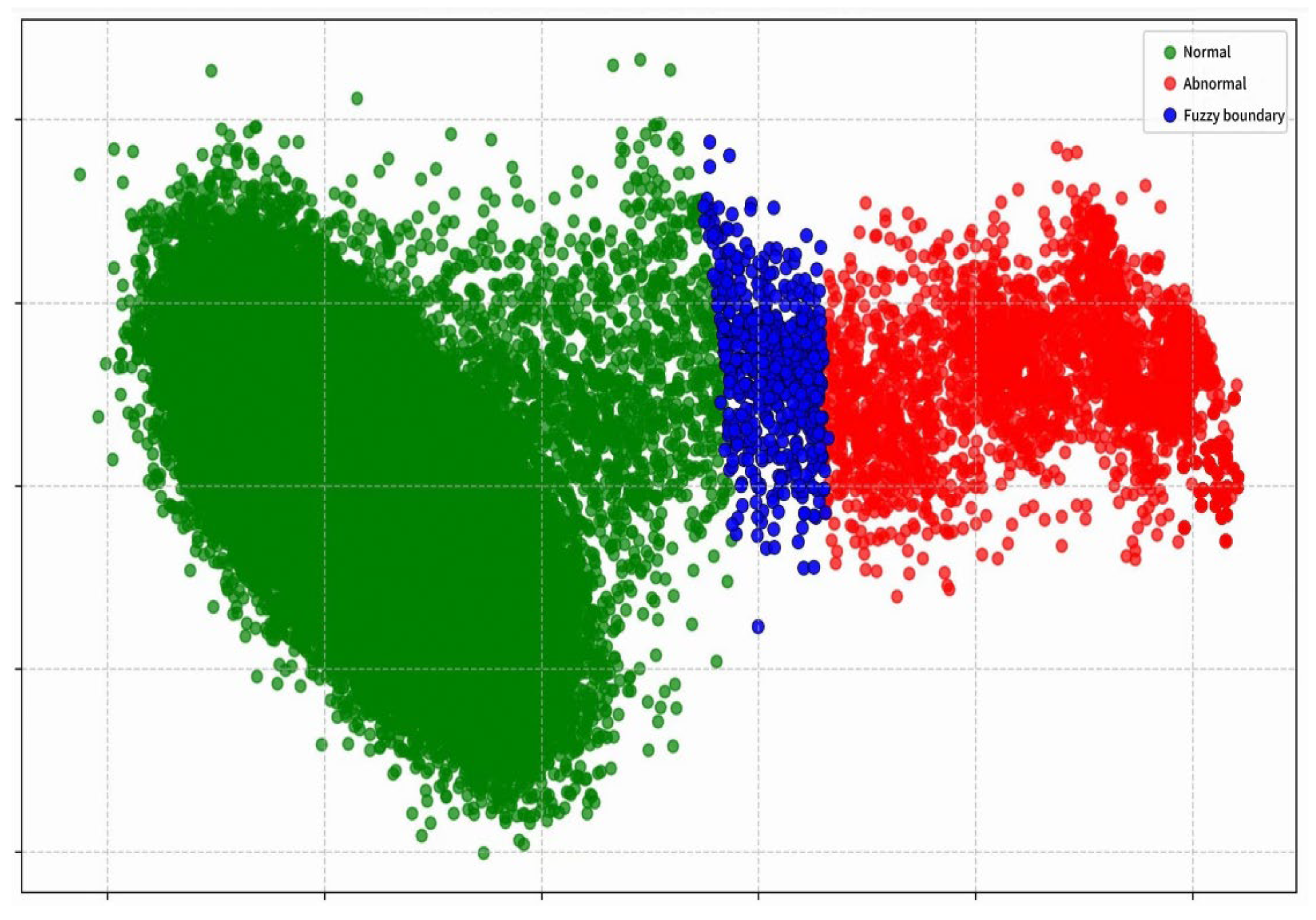 Figure 8 shows the effect of using Fuzzy clustering algorithm to classify low-dimensional data. In the test set data, normal and abnormal data were classified in an 8:2 ratio. In this diagram, green represents normal data, red represents abnormal data, and blue represents data with fuzzy boundaries.
