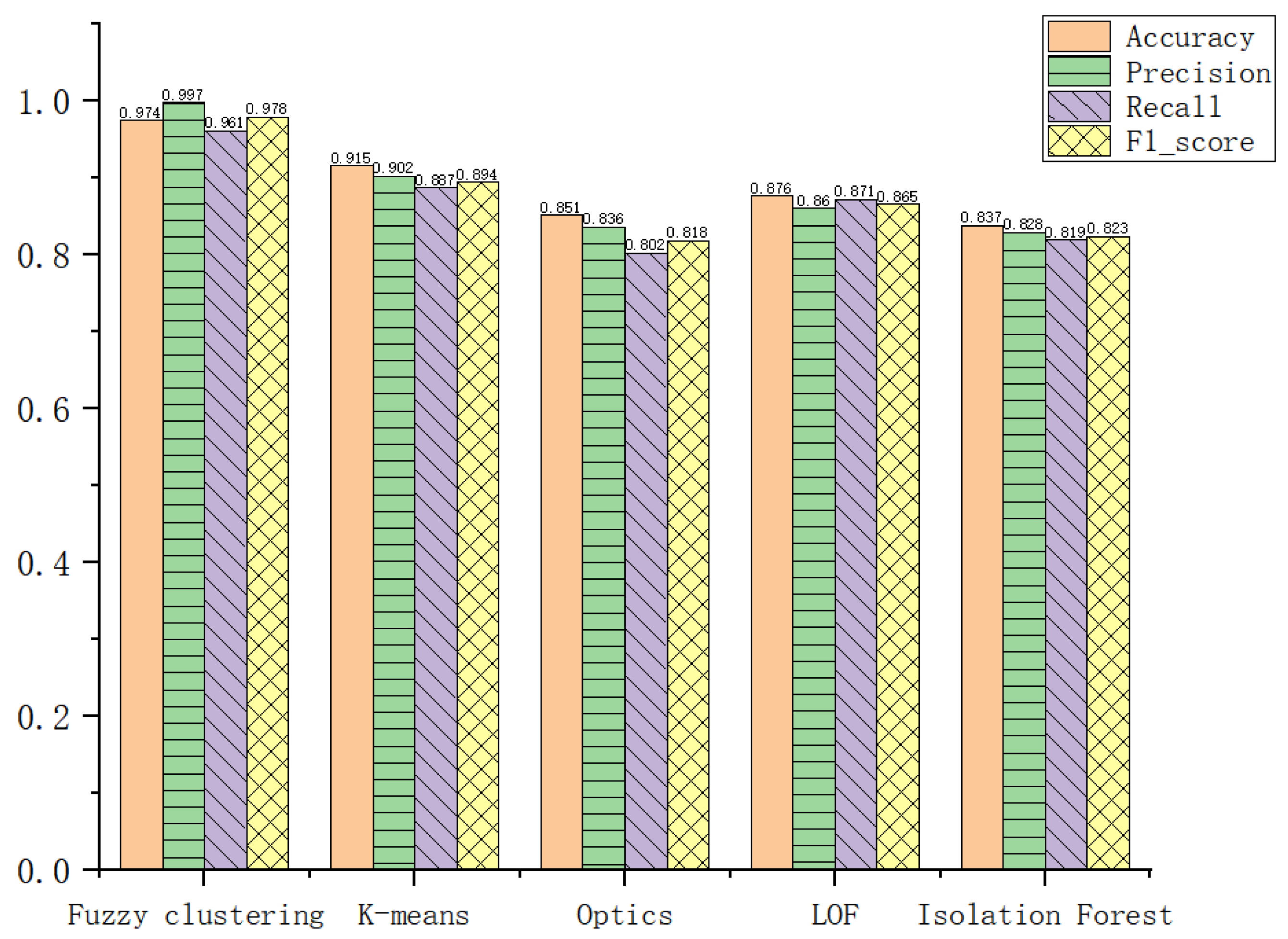 Centered on the fuzzy clustering algorithm proposed in this study, an exhaustive performance comparison and analysis were performed against four classic and mainstream comparative algorithms: the traditional K-Means clustering algorithm, the OPTICS density clustering algorithm, the LOF algorithm, and the Isolation Forest algorithm.