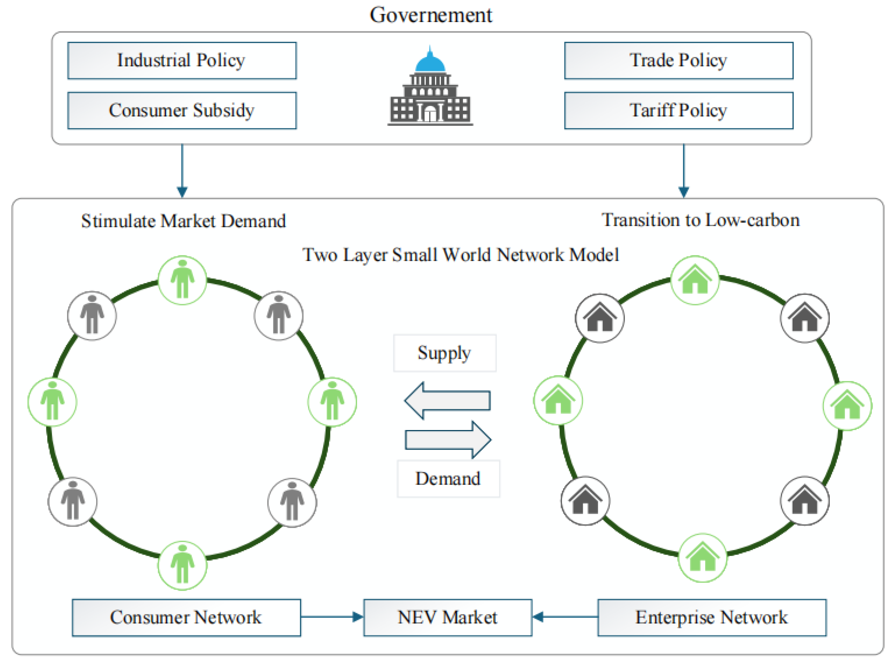 The evolutionary game based on complex networks is composed of three elements: network structure, different participants and strategy evolutionary rules. The main participants in the diffusion model of NEVs include the government, automobile manufacturers and consumers. In the model, the government is responsible for formulating relevant policies, enterprises choose between producing NEVs and FVs, and consumers choose between purchasing NEVs and FVs. Based on a small-world network, this paper establishes a strategic game model to explore decision-making and diffusion mechanisms of enterprises and consumers. The overall model structure is illustrated in