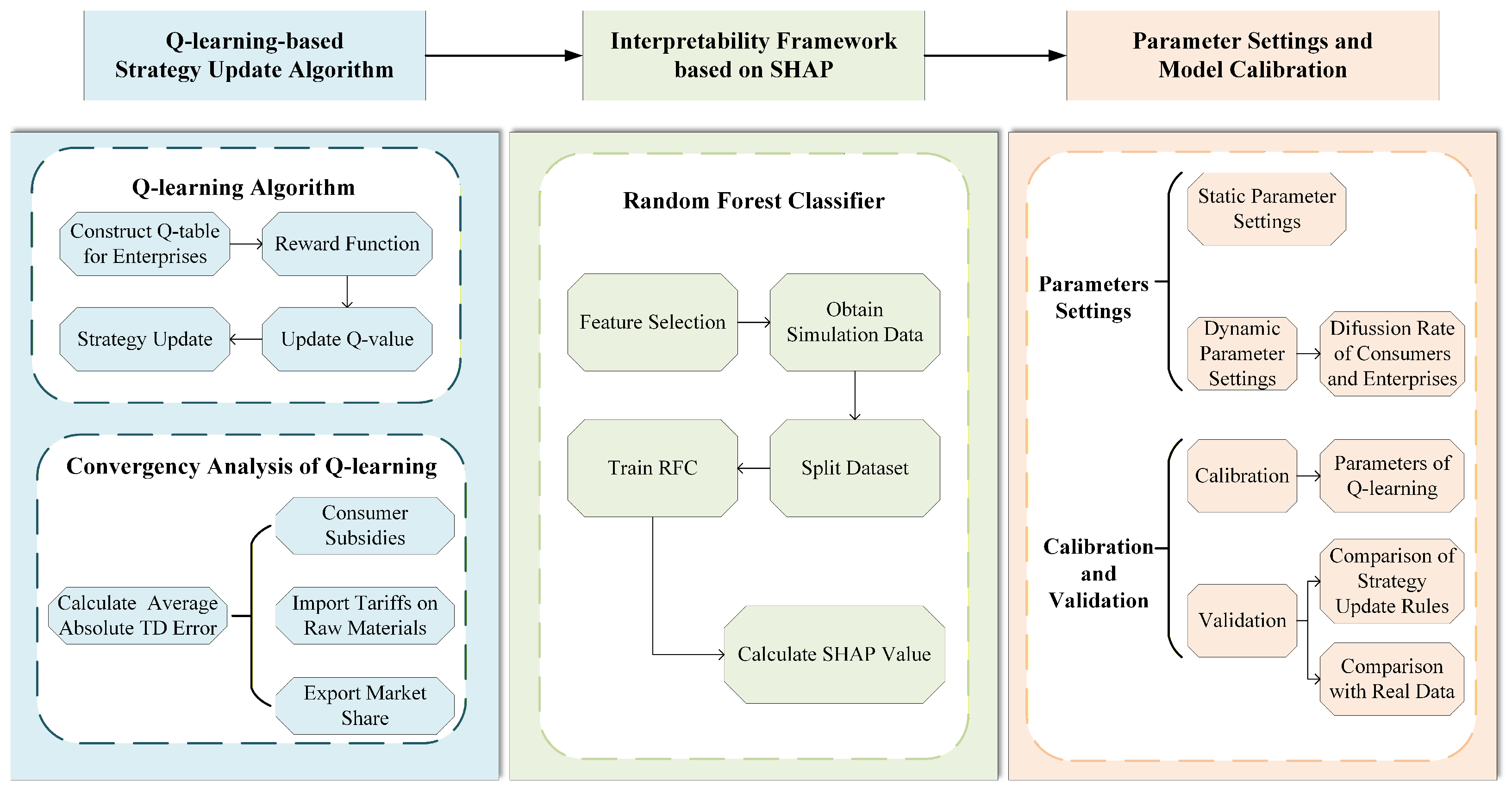 We proposed an interpretable decision-making framework based on RL and SHAP. We adopted the Q-learning algorithm as the decision-making process of enterprise in the model to reflect the learning behavior. Meanwhile, we used the SHAP method to evaluate the feature importance affecting enterprises’ decisions.
