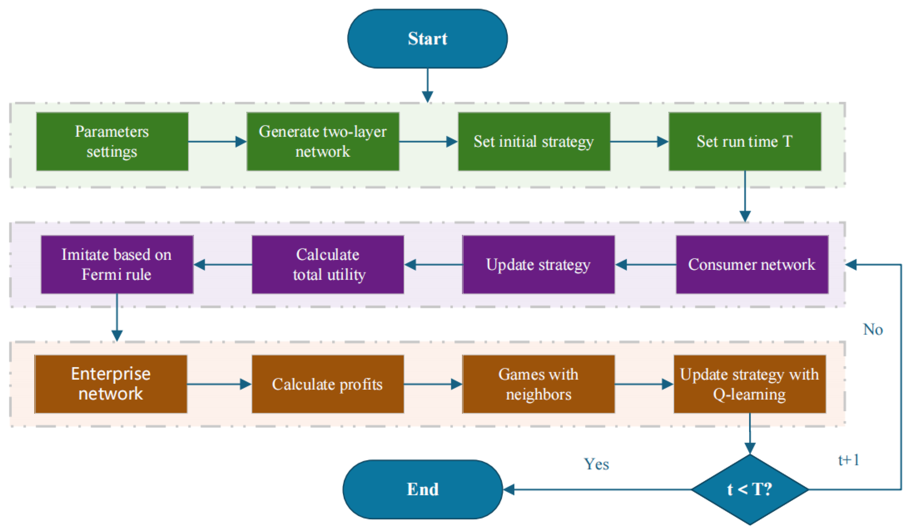 In the existing literature, the evolution of consumer preferences or enterprises’ low-carbon production strategies is based on traditional evolutionary rules, such as the Fermi rule. Under this rule, the agents in the model imitate the preferences or strategies of their neighbors with a certain probability, which is influenced by the utility differences among consumers or the profit differences among enterprises. However, these imitation-based evolutionary rules struggle to capture the trial-and-error and learning behaviors of real-world agents in their decision-making processes [