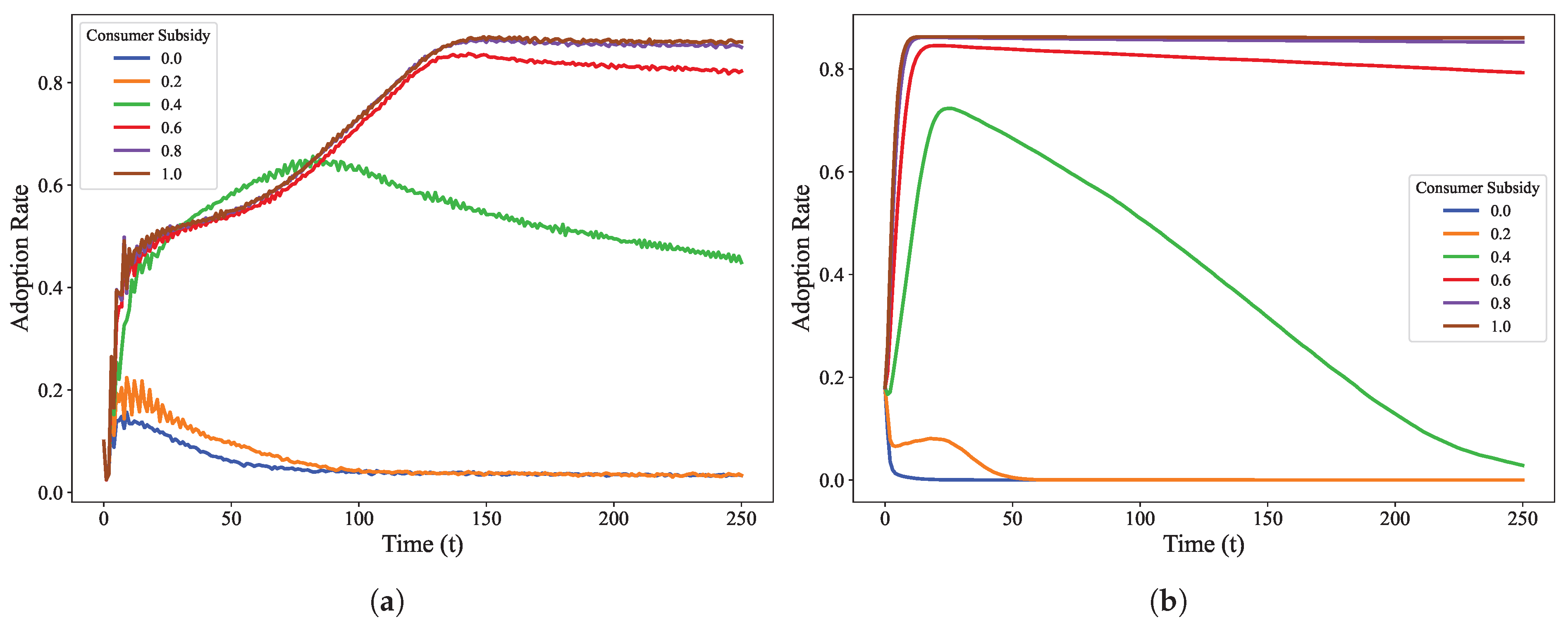 , the adoption rate shows a downward trend after an initial rise, indicating that the incentive is insufficient to sustain long-term market diffusion. Conversely, in high-subsidy scenarios (