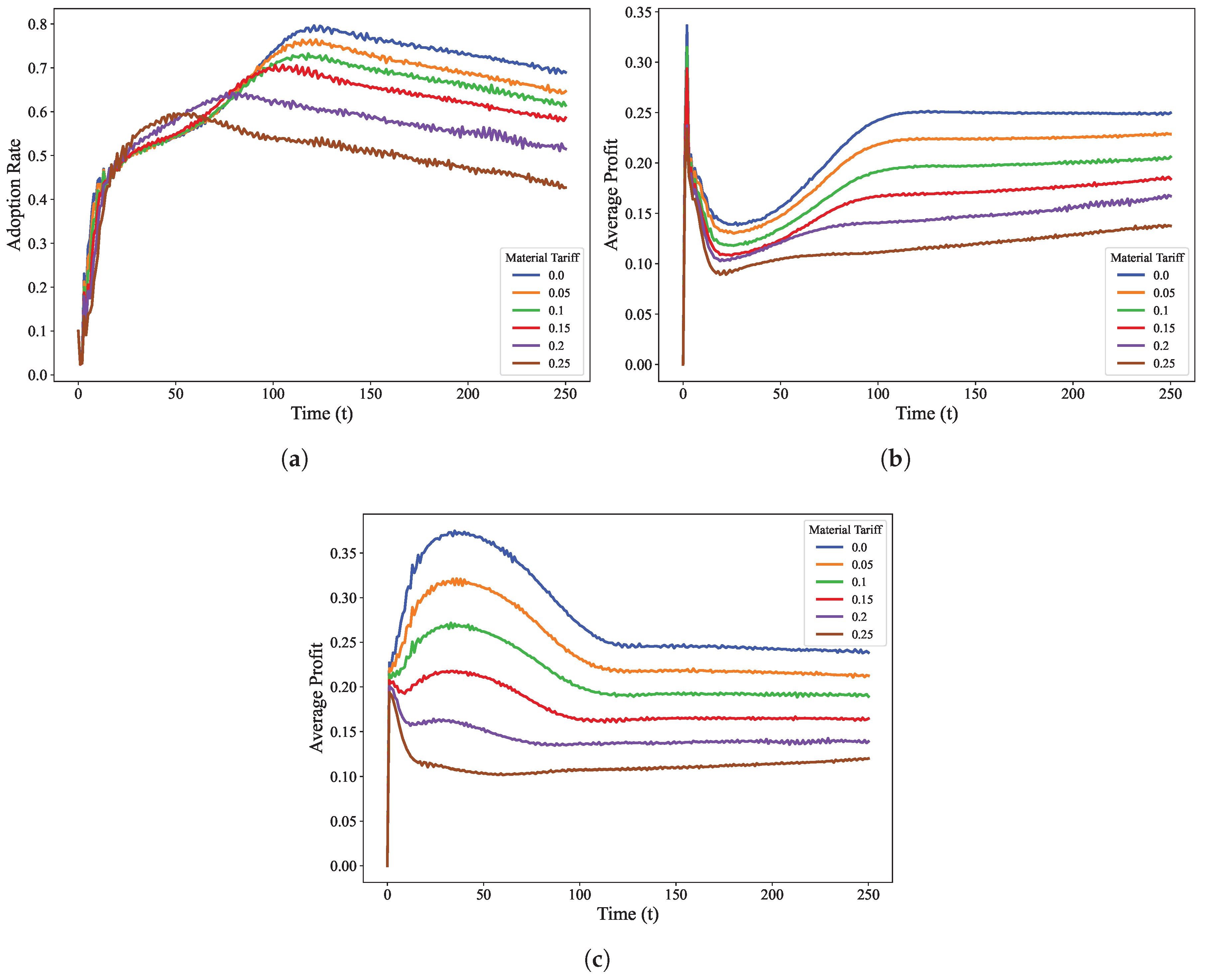 The government’s reduction in import tariffs on key raw materials for NEVs (e.g., lithium, cobalt, and nickel) can lower manufacturers’ production costs, thereby reducing the overall cost of NEV manufacturing. This decrease in costs directly enhances the profitability of NEV producers and increases their willingness to supply. To examine the impact of raw material import tariff adjustments on the diffusion rate of enterprise adoption, this study analyzes how varying tariff rates (0%, 5%, 10%, 15%, 20%, and 25%) influence the proportion of NEV manufacturers and their average cumulative profits. The lower bound of import tariffs reflects the current realistic baseline; the provisional tariff rate for key raw materials such as lithium and cobalt carbonate is 0% [