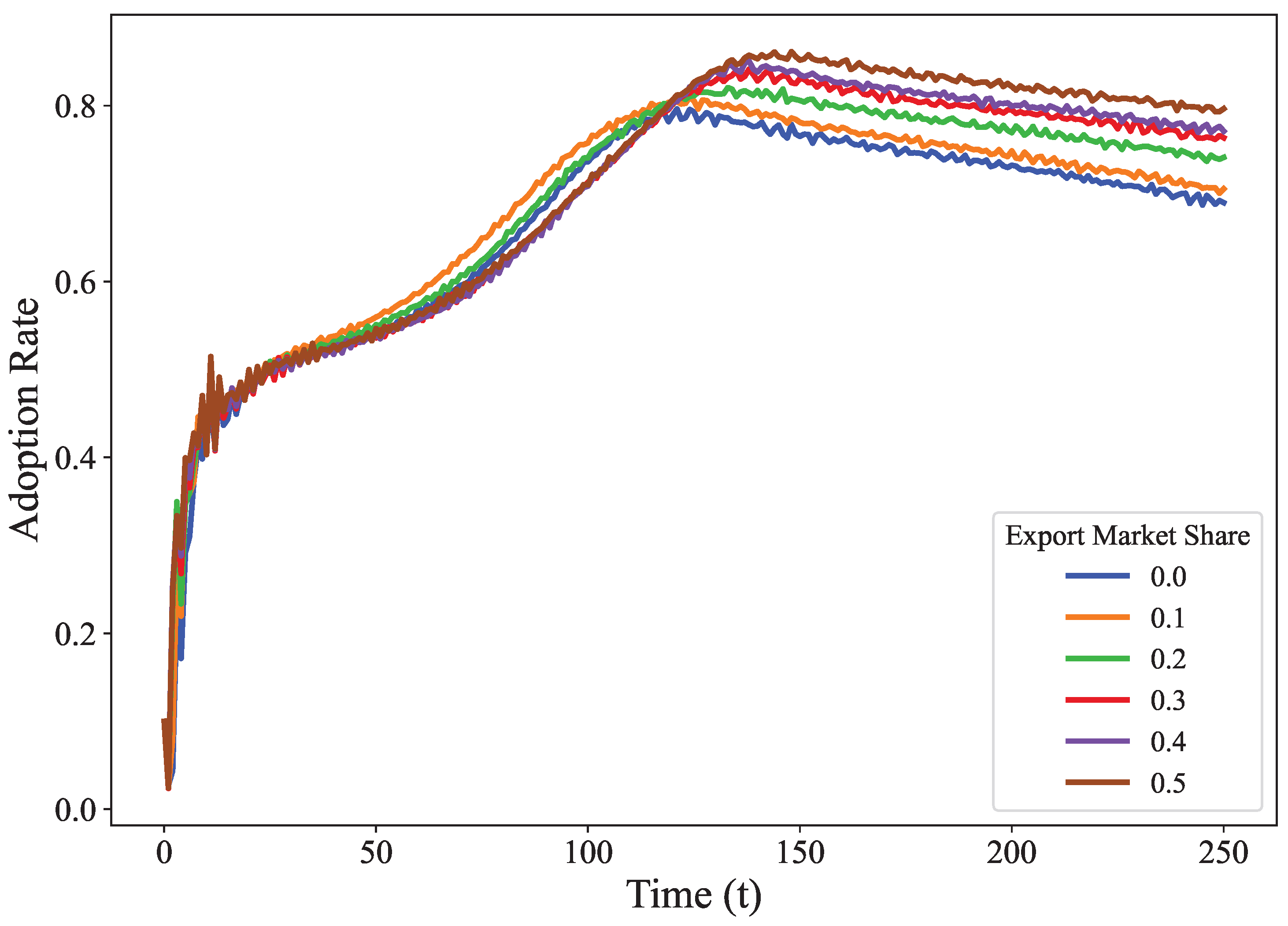43]. Therefore, in order to explore the impact of tariffs imposed by other countries on China’s NEVs on the diffusion rate, this experiment assumes that the overseas market share of NEV enterprises varies from 0% to 50%. Simulation results are shown in