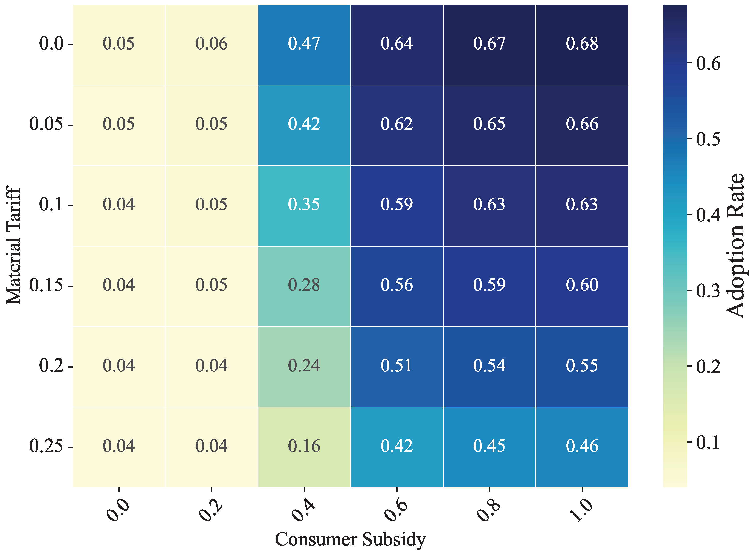 Under a high-subsidy scenario, the negative impact of import tariffs is significantly reduced. Even with the maximum import tariff level, an adoption rate of 0.46 is maintained when the consumer subsidy . This suggests that when governments implement relevant policies, they should design the primary policy from the perspective of stimulating demand, and import tariffs can be considered as a supplementary policy.