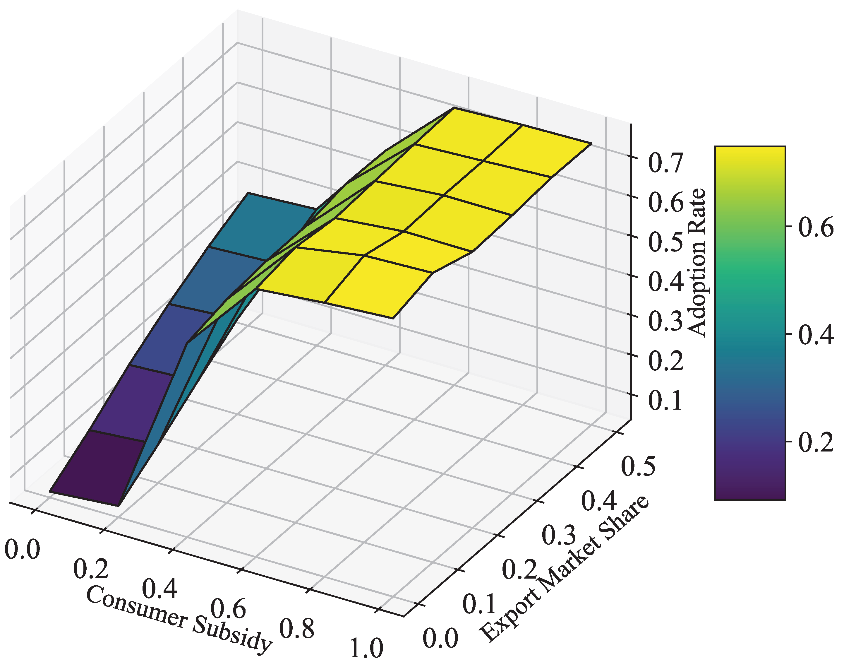 represents a critical “tipping point” where the market successfully transitions from instability to sustainable growth. Therefore, to effectively assess the impact of trade policies, we set the subsidy factor at a baseline of