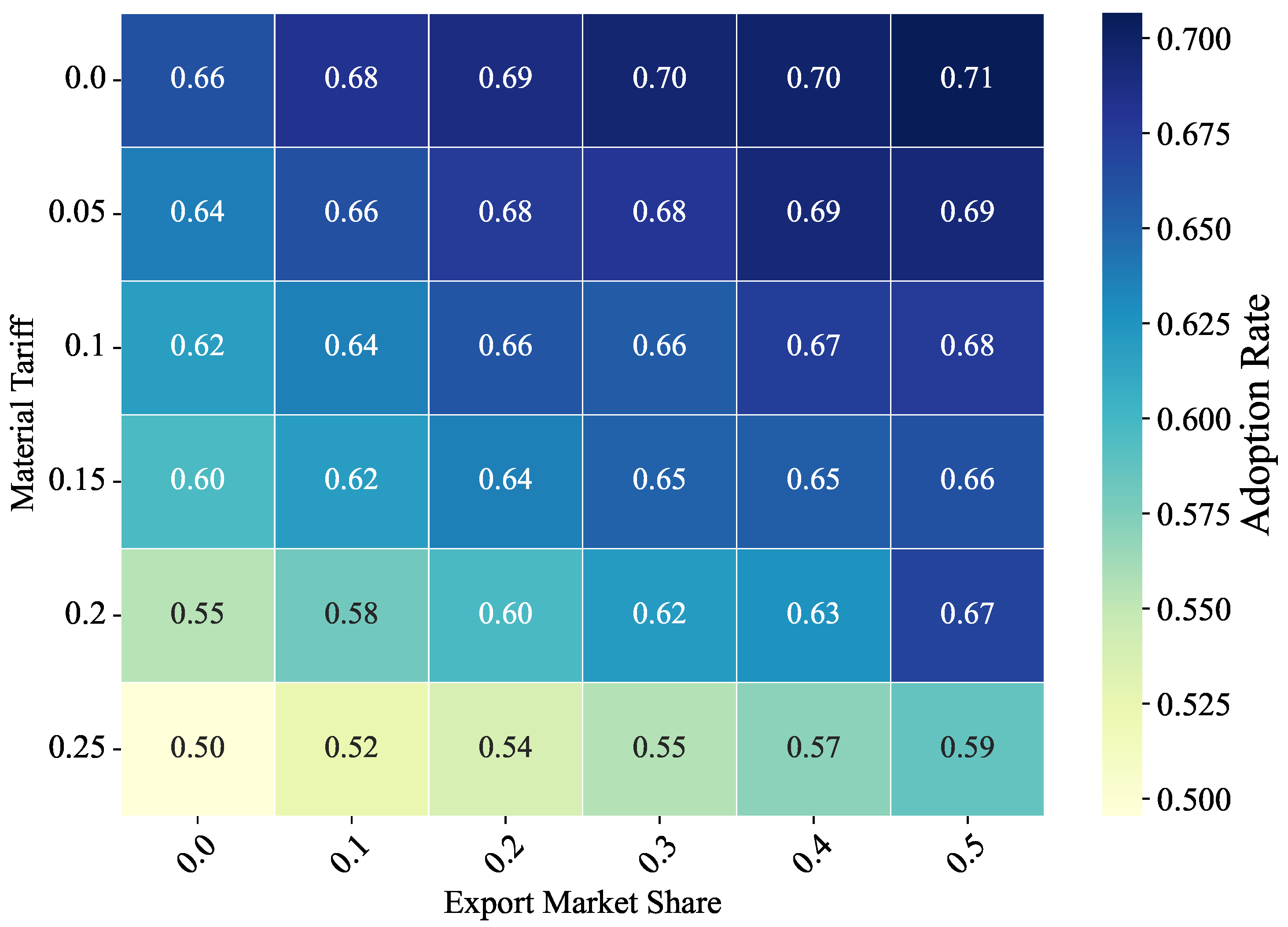 When raw material tariffs are low (e.g., 0 and 0.05) and overseas market shares are high, the diffusion rates are generally high, ranging from 0.68 to 0.71. This combination provides enterprises with both market and cost incentives, accelerating the diffusion of NEVs. As raw material tariffs gradually increase (e.g., from 0.1 to 0.25), the diffusion rates gradually decrease, particularly when overseas market shares are low (0 or 0.1). For example, when the tariff is 0.25 and the overseas market share is close to 0, the diffusion rate is only 0.50, indicating that the combination of higher tariffs and lower market shares severely suppresses diffusion rates. In this scenario, enterprises face higher production costs and limited export opportunities, lacking sufficient market demand support, ultimately inhibiting the diffusion of NEVs.
