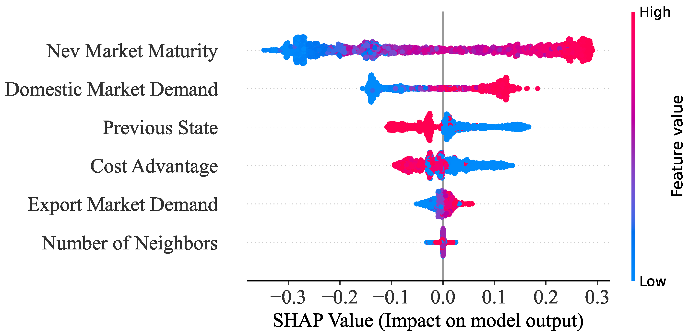 From the perspective of network structure, the number of an enterprise’s neighbors exhibits a relatively low SHAP value, indicating a limited marginal impact on decision-making outcomes. However, this result does not contradict the theoretical importance of the small-world network. In the model, the network serves as a fundamental information channel through which enterprises observe neighbors, acquire information, and update their production strategies. The existence of such a network structure is a necessary precondition for localized learning and strategy adaptation. Once this information channel is established, increasing or decreasing the number of neighbors will either introduce redundant information or lead to information insufficiency. Therefore, a low SHAP value reflects the very limited incremental effect of the number of neighbors in an already well-connected network, rather than negating the core role of the small-world network in enabling information acquisition and strategic adjustment.