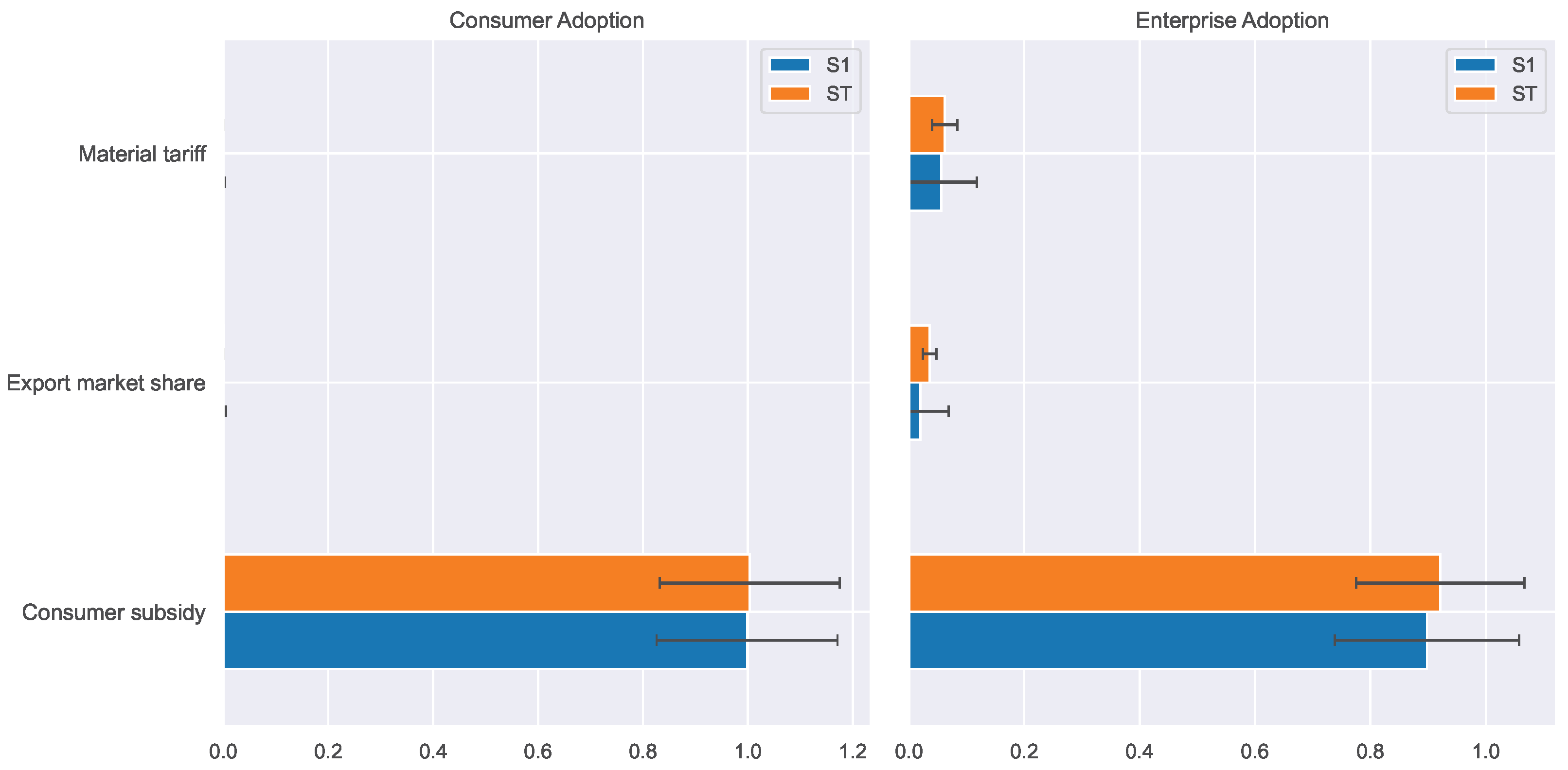 Figure 13 shows the first-order (S1) and total-effect (ST) Sobol indices for the three policy parameters. The consumer subsidy exhibits S1 close to 1 for consumer diffusion rate and S1 close to 0.9 for enterprise diffusion rate, indicating that subsidies alone explain almost all output variance. This reflects the model structure: subsidies directly enter the consumers’ economic utility, which immediately affects adoption probability and subsequently propagates through the enterprise layer by altering demand and profitability. The ST index is also high, confirming that subsidies dominate not only as an independent factor but also through interactions, since all other parameters exert their influence primarily via enterprise profit, which is also shaped by consumer demand.