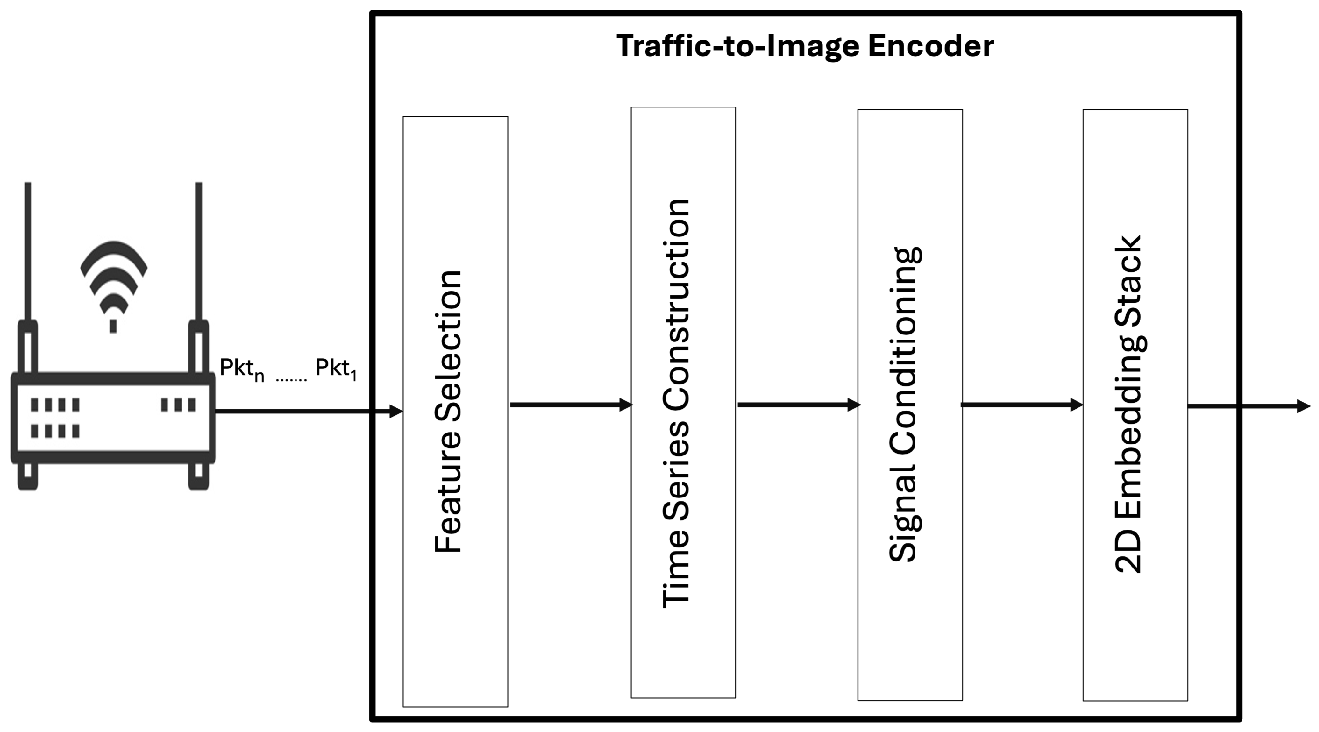 For WST-based features, we used a configuration with J = 2 scales, L = 4 angular filters, and maximum scattering order = 2, implemented using the Kymatio framework. Increasing the number of scales beyond J = 2 resulted in a substantial increase in computational cost without corresponding improvements in classification performance. Retaining second-order scattering coefficients proved beneficial, as they effectively capture higher-order interactions and modulation-style variability in traffic dynamics that are characteristic of device-specific behavior.