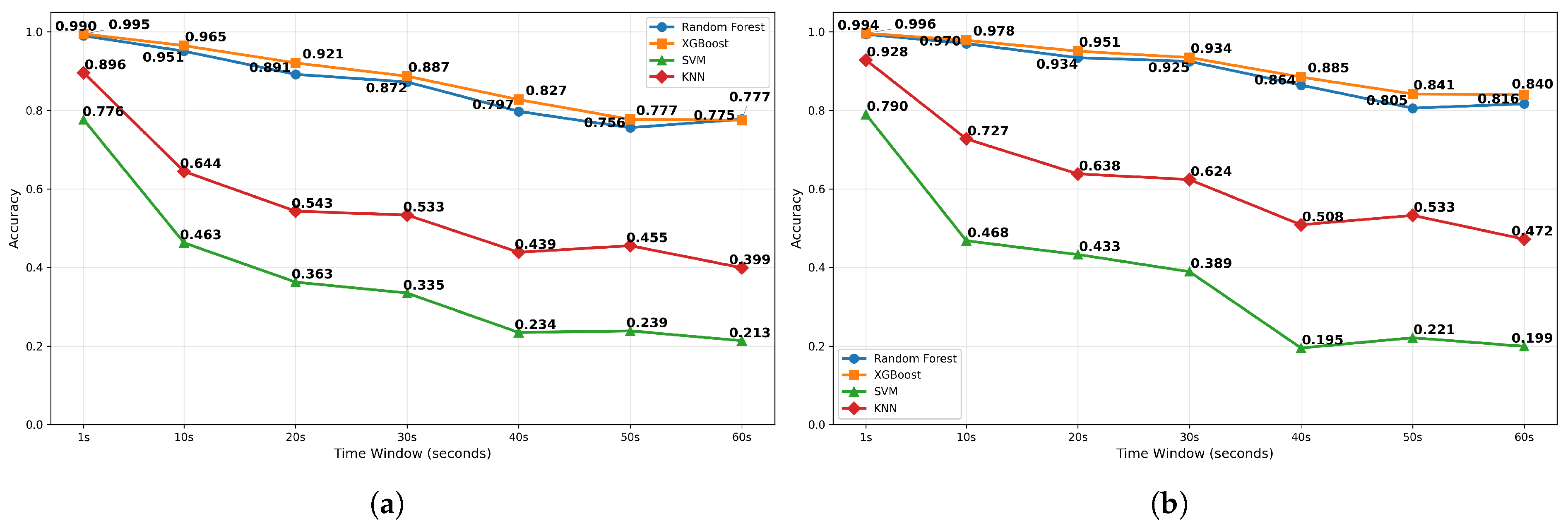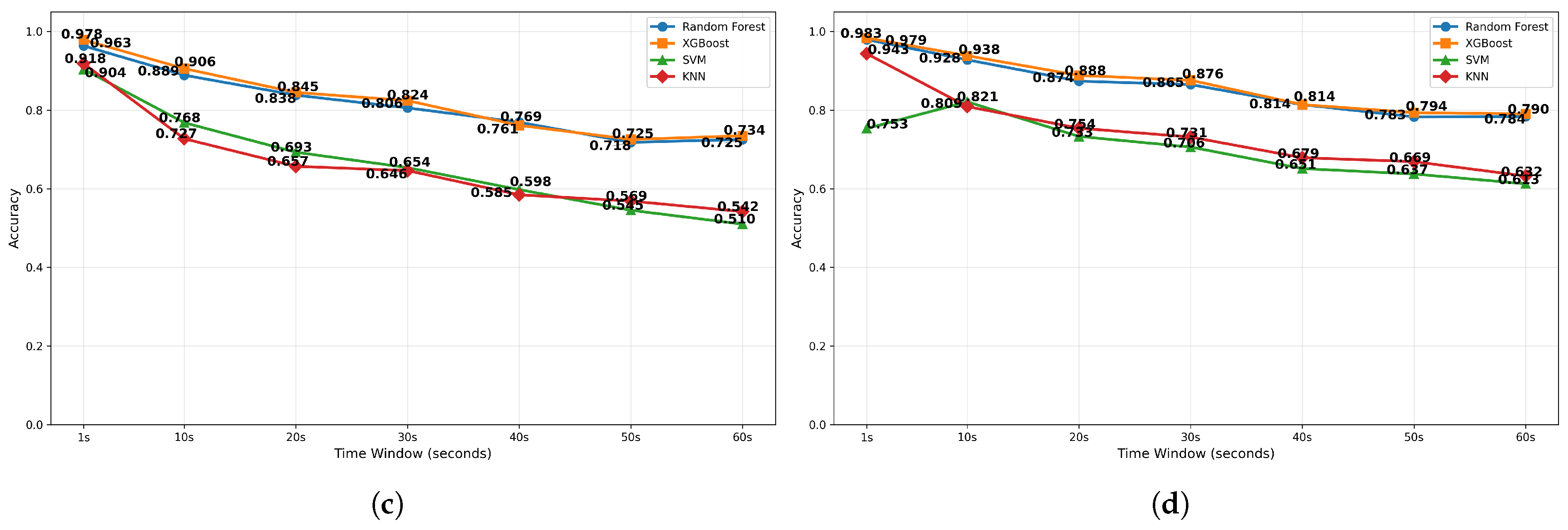 Figure 4c,d illustrate the models’ accuracy for both individual IoT device identification and IoT device type classification using WST features. The four figures show the highest classification accuracy across all models is achieved at a 1 s sampling rate. As the sampling interval increases—in increments of 10 s up to 60 s—the accuracy consistently declines. At the 60 s sampling rate, all models demonstrate their lowest performance, indicating that coarse temporal granularity leads to a loss of critical behavioral patterns necessary for effective classification. Based on these results, a 1 s sampling rate is selected for the remaining experiments, as it provides the best trade-off between signal resolution and model accuracy for both device-level and type-level identification tasks.