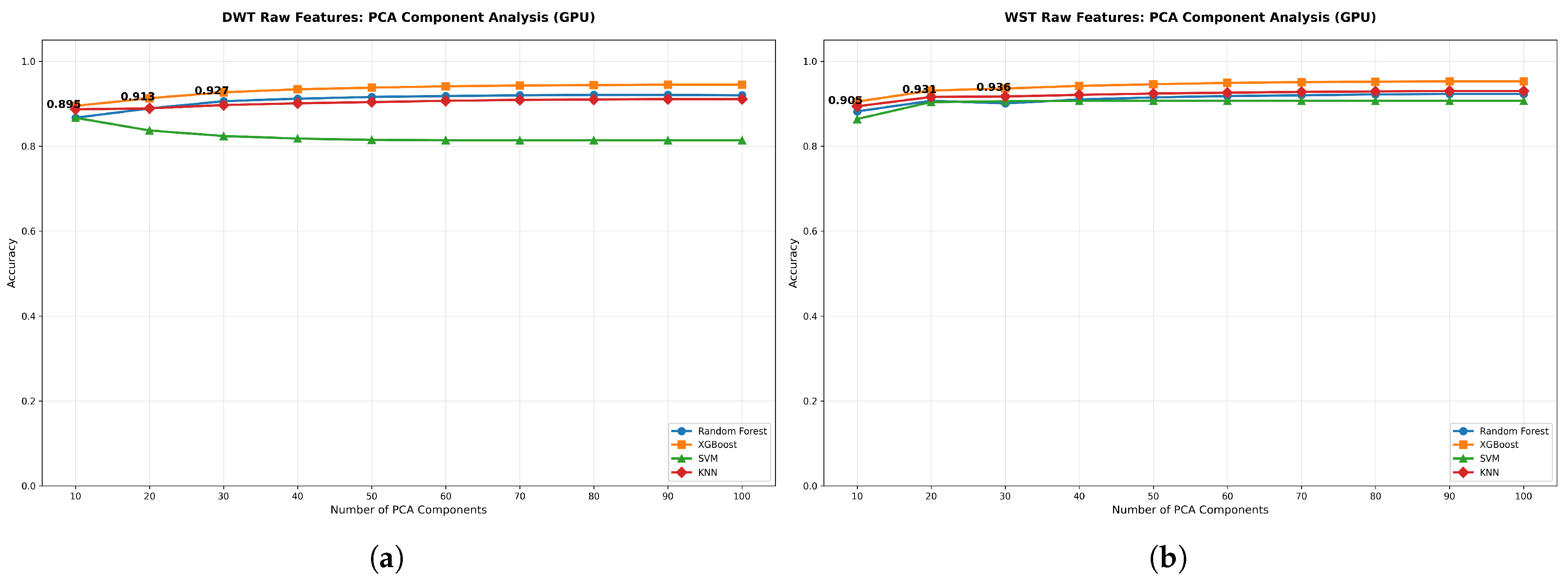 Figure 5b presents the results for WST-based features. The trend mirrors that of the DWT experiment: model accuracy increases up to approximately 30 features, after which it plateaus, indicating that the most informative components are concentrated in the first few dimensions.