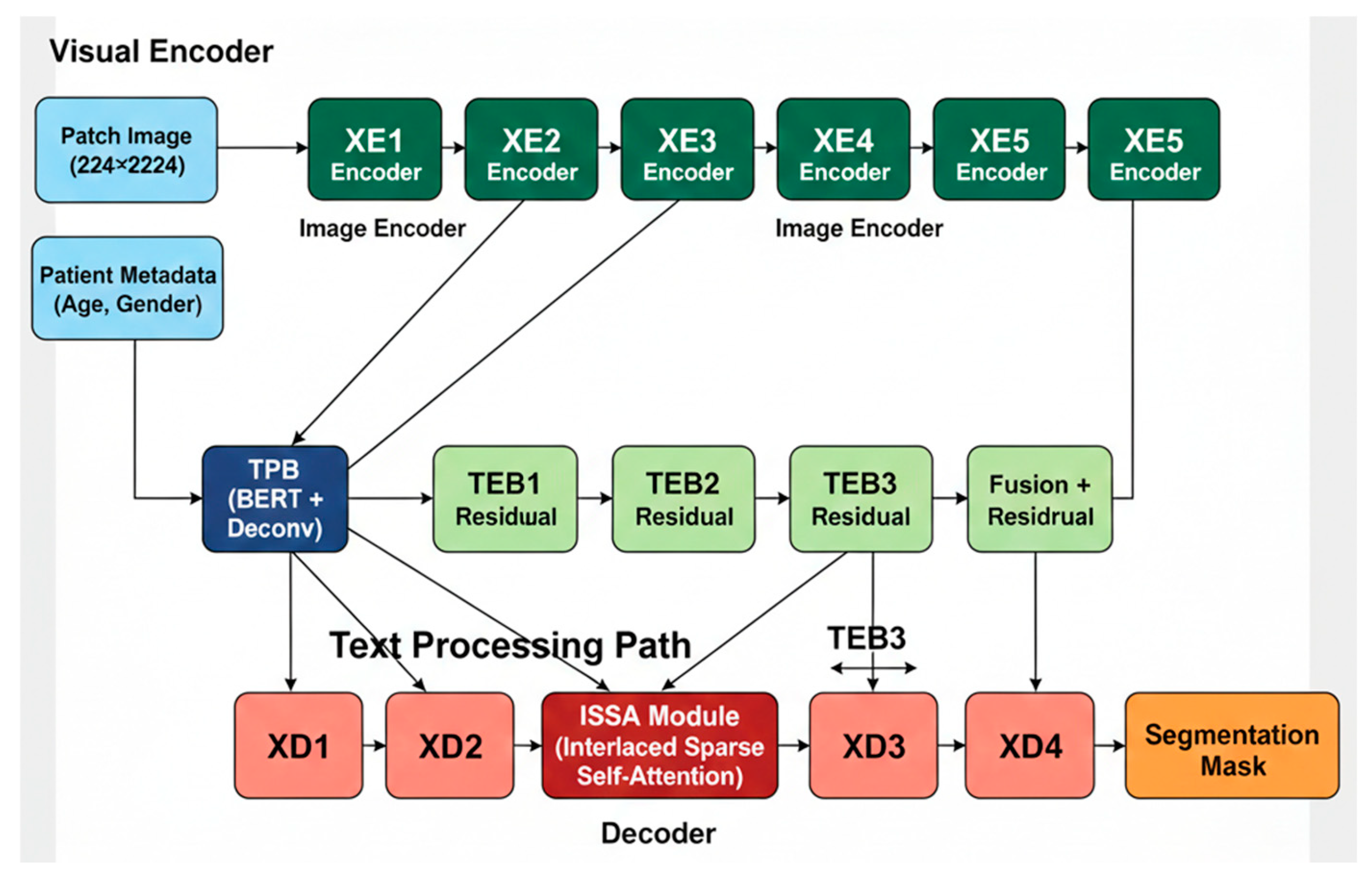 The fundamental novelty of the TPB + TEB fusion strategy lies in its hierarchical, multi-scale integration mechanism. Unlike conventional methods that fuse metadata once (e.g., via channel concatenation at the bottleneck), our framework injects BERT-processed metadata at three distinct resolution levels through the TEB modules. Each TEB performs channel-wise concatenation followed by residual refinement, enabling the network to dynamically modulate visual features using clinical context appropriate to each scale. This design ensures that low-level texture details benefit from metadata-guided attention just as high-level semantic decisions do—something unattainable with flat fusion schemes.