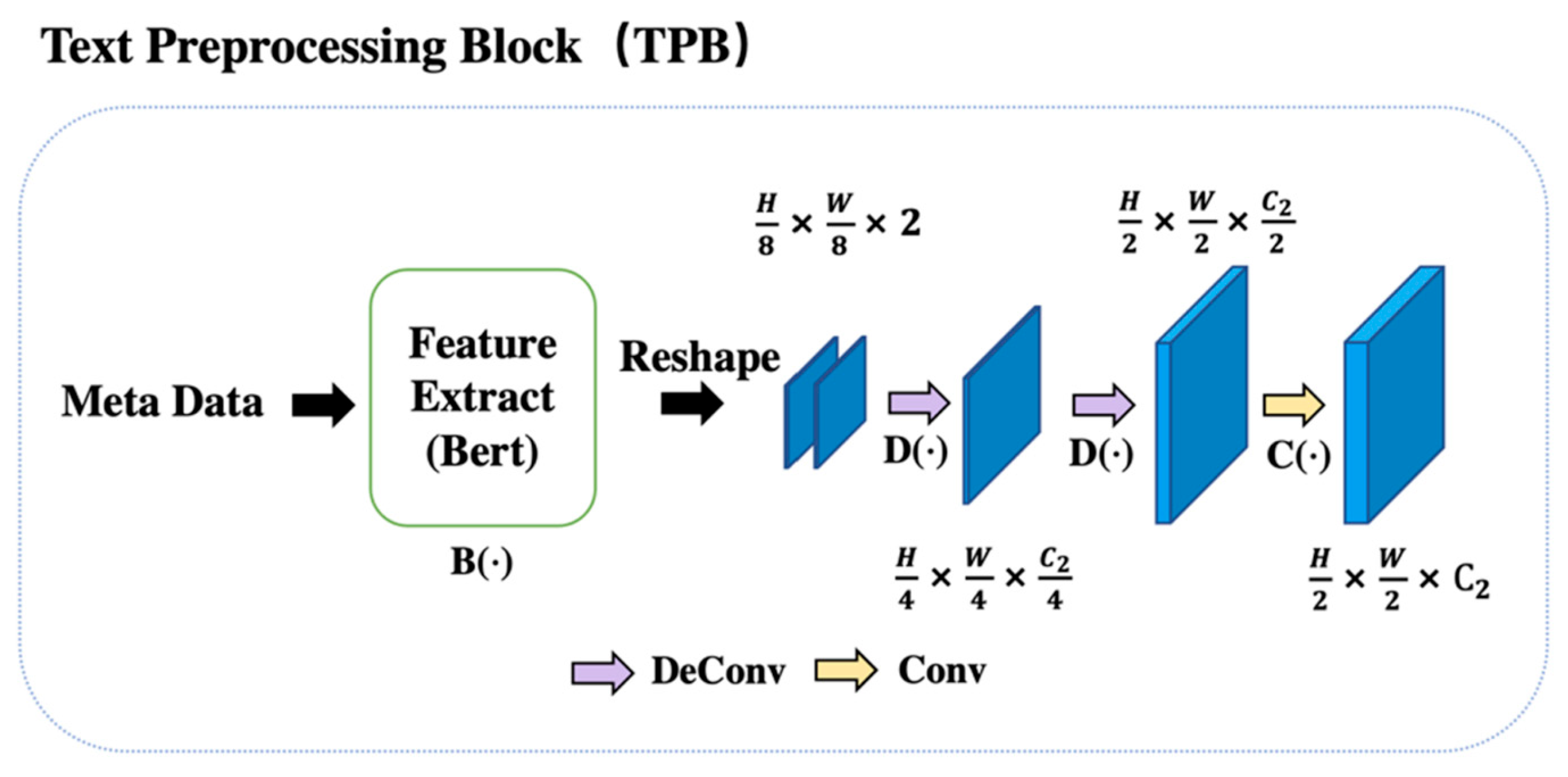 After using BERT to extract feature vectors from each metadata item, each metadata corresponds to a 1 × 768-dimensional vector. Since each image corresponds to two metadata items (gender and age, or malignancy and differentiation degree), the final text vector for each image is 2 × 768-dimensional. For easier processing, 16 zeros are appended to the end of each metadata vector, resulting in a 2 × 784-dimensional vector, which is then reshaped into a 2 × 28 × 28 text vector. In the TPB, both deconvolutions use 3 × 3 kernels, stride 2, padding 1, and output padding 1. The first deconvolution uses 16 kernels, outputting a 16 × 56 × 56 feature map. The second uses 32 kernels, outputting a 32 × 112 × 112 feature map. After a same convolution with 64 kernels, the feature map size becomes 64 × 112 × 112, matching the image feature map size. The model parameters were optimized using the Adam optimizer, which provides adaptive learning rate adjustment for efficient convergence. The training process adopts widely used optimization strategies reported in previous deep learning studies [