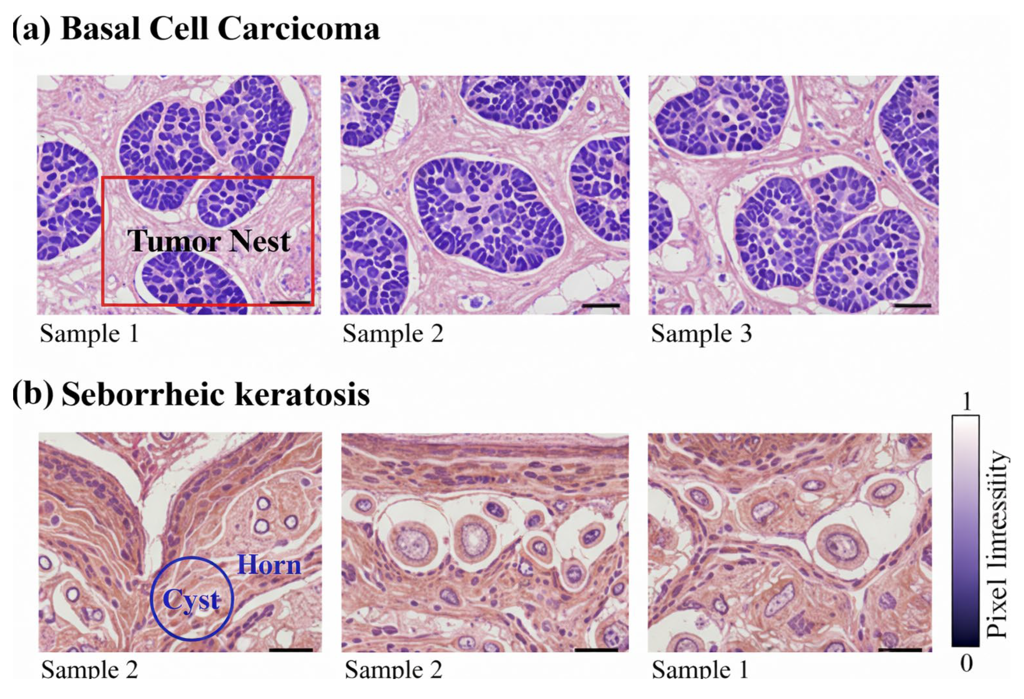 Figure 5 shows the example patch-level images of basal cell carcinoma and seborrheic keratosis after stain normalization.