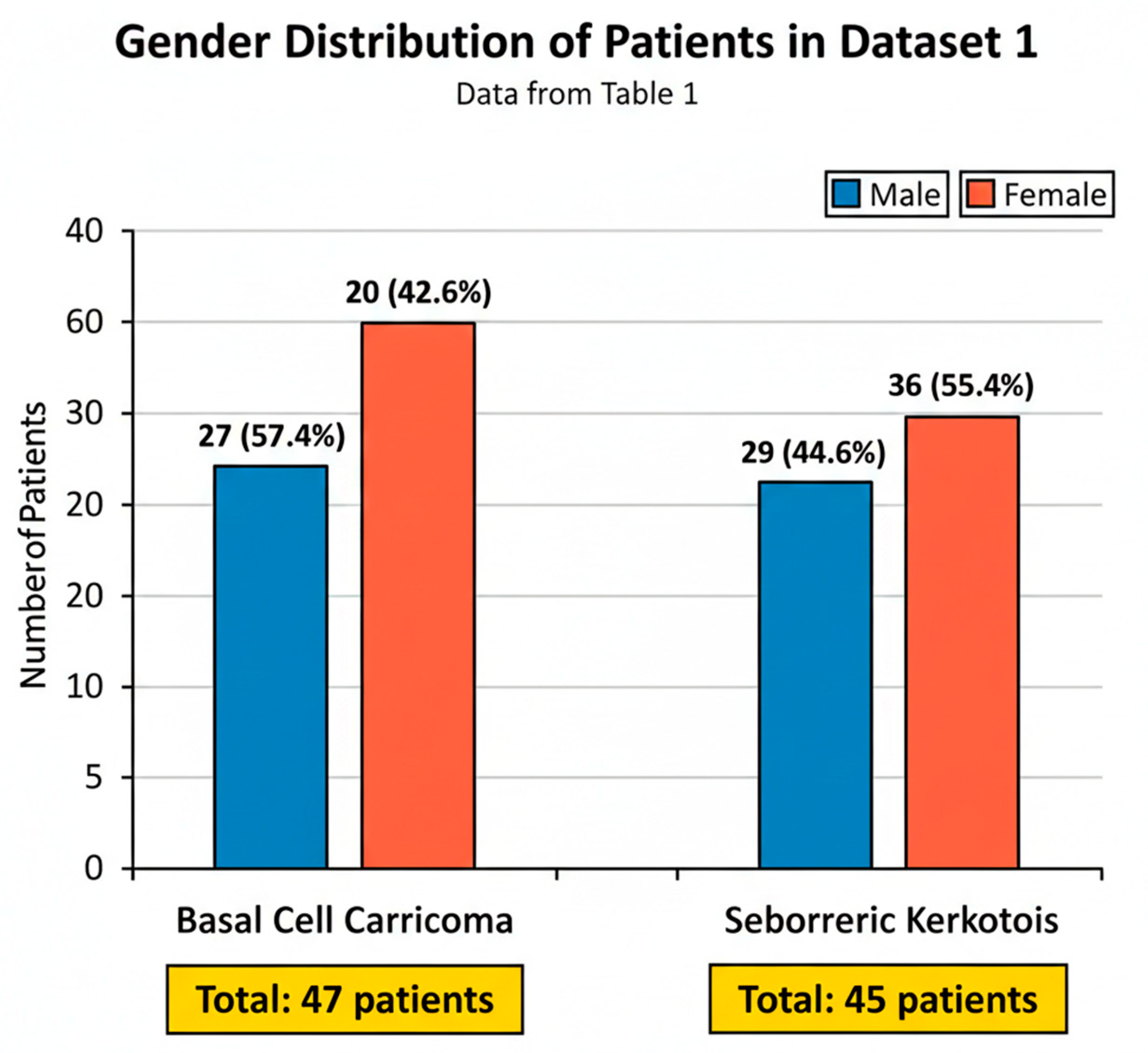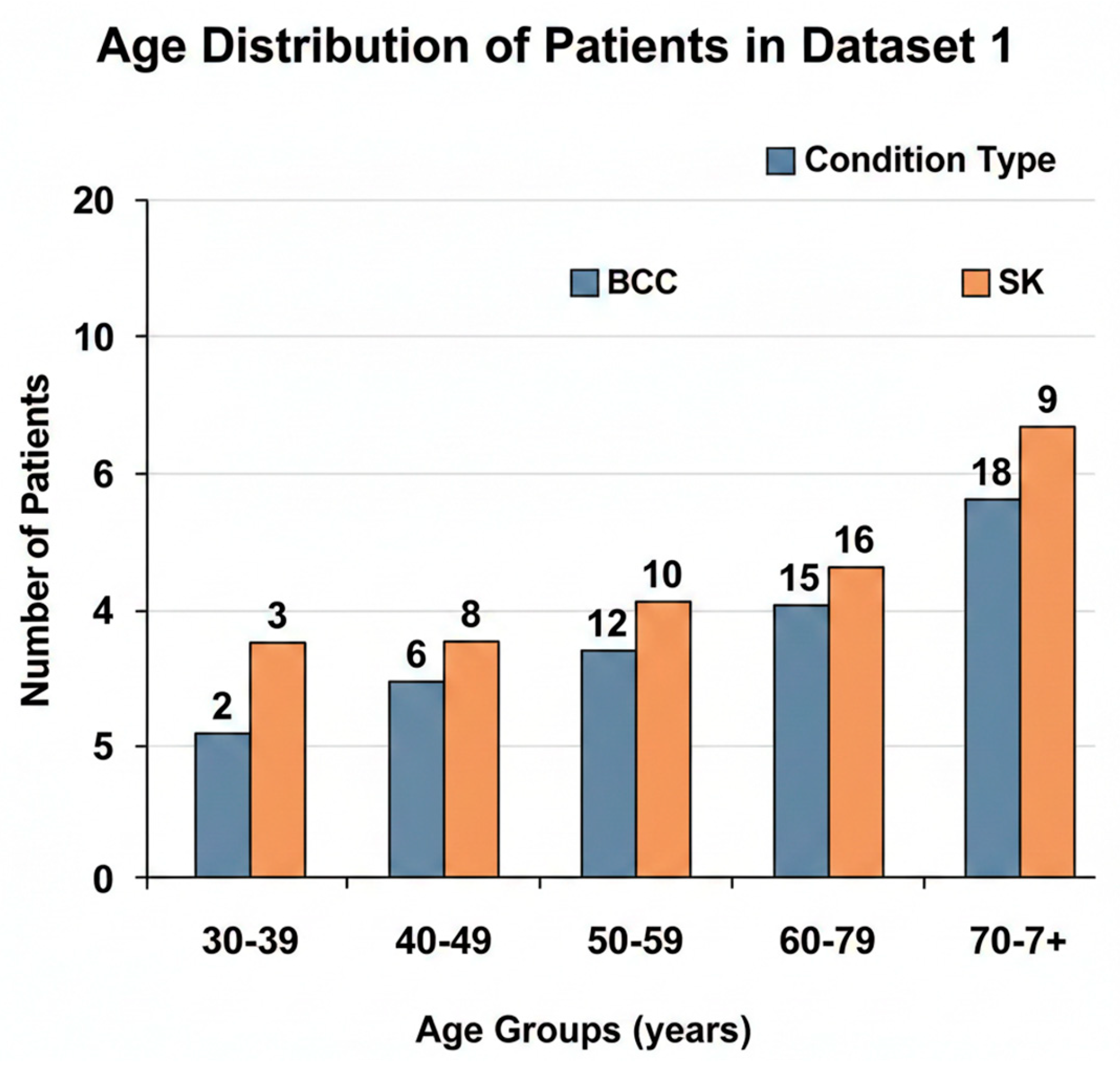 Figure 7 show the gender and age distributions of the 112 patients corresponding to the WSI. BCC represents basal cell carcinoma, and SK represents seborrheic keratosis. The distributions indicate that the average age of basal cell carcinoma patients is higher than that of seborrheic keratosis patients, and the number of female patients exceeds that of male patients for both diseases.