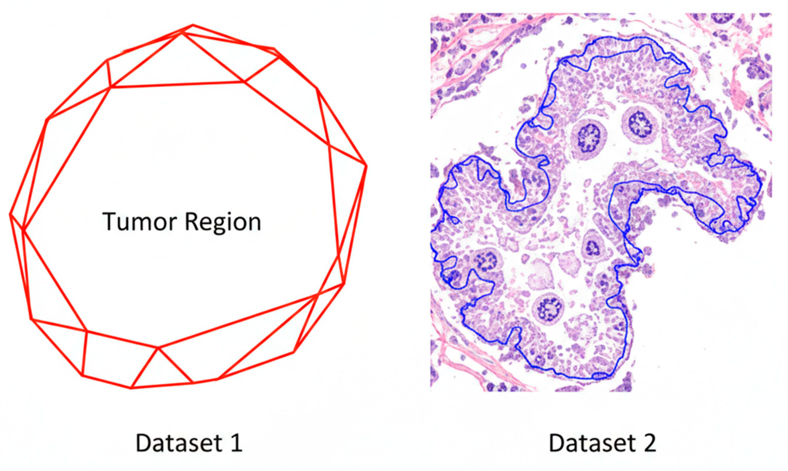 It should be noted that, although Dataset 1 and Dataset 2 are both datasets for basal cell carcinoma and seborrheic keratosis, they come from different hospitals and were annotated by different pathologists, resulting in different annotation styles. Specifically, Dataset 2 annotations are fine-grained, while Dataset 1 annotations are coarse-grained, as illustrated in