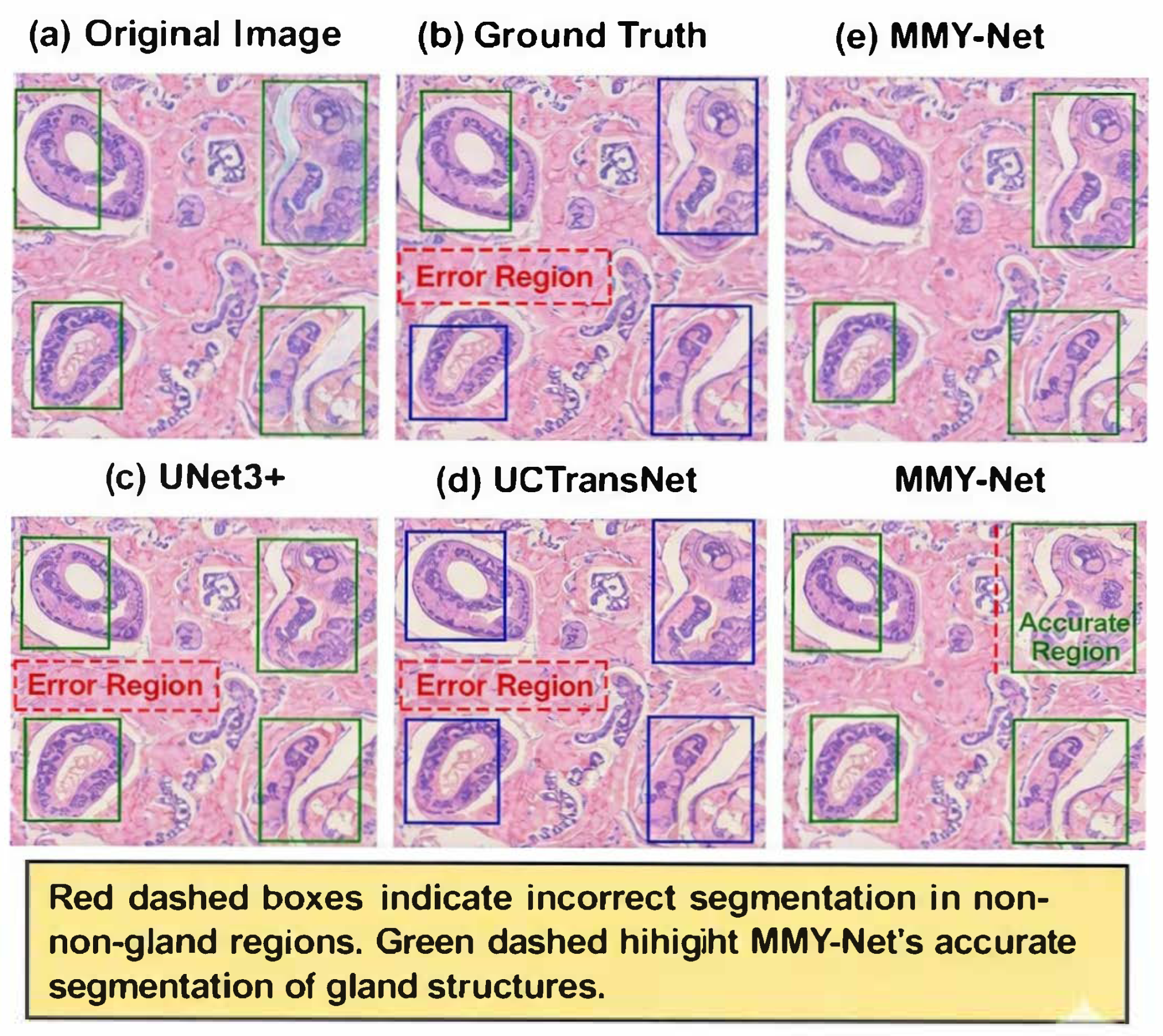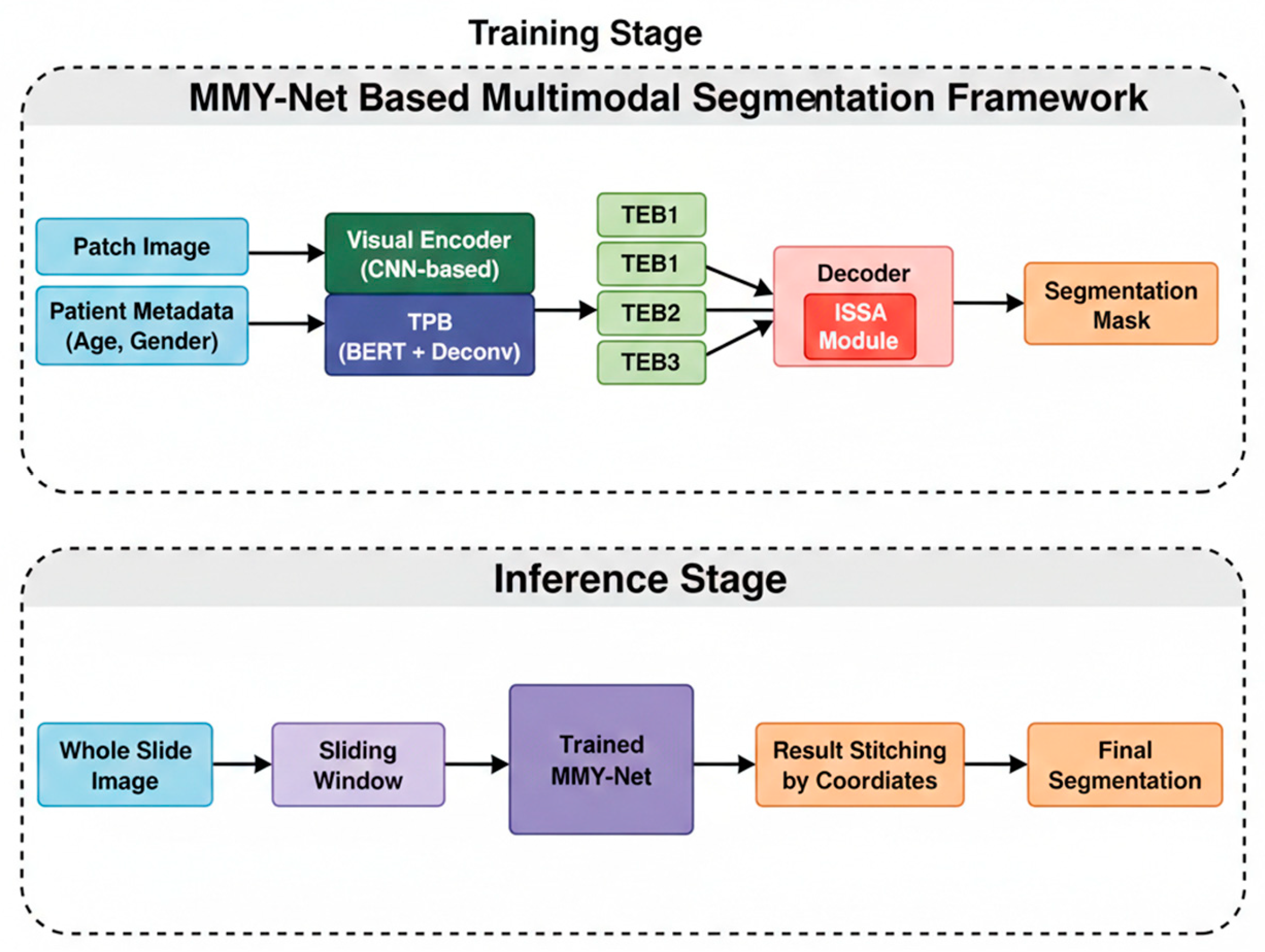 After inputting the slices into the trained MMY-Net for inference and obtaining segmentation results, use the position coordinates to stitch the results back to the original image. Specifically, place each slice’s segmentation result at its corresponding position in the original image. The final stitched image is the tumor segmentation result for the entire slide.