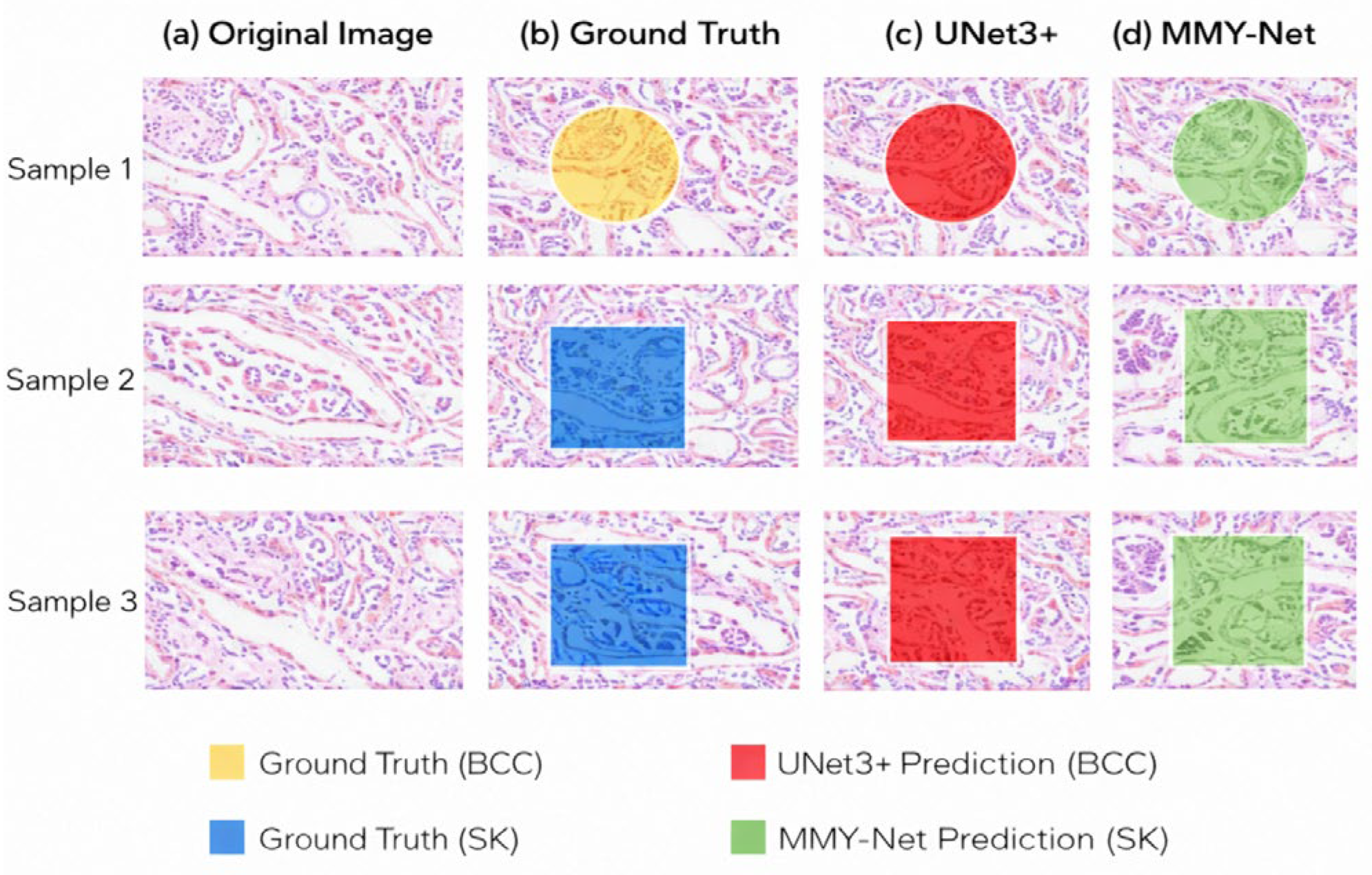 In experiments on Dataset 1/Dataset 2, the basal cell carcinoma region in each WSI is defined as pixel label “1”, seborrheic keratosis region as label “2”, and other regions as background “0”. Since basal cell carcinoma and seborrheic keratosis cannot coexist in the same image, segmentation metrics are calculated separately for each disease.
