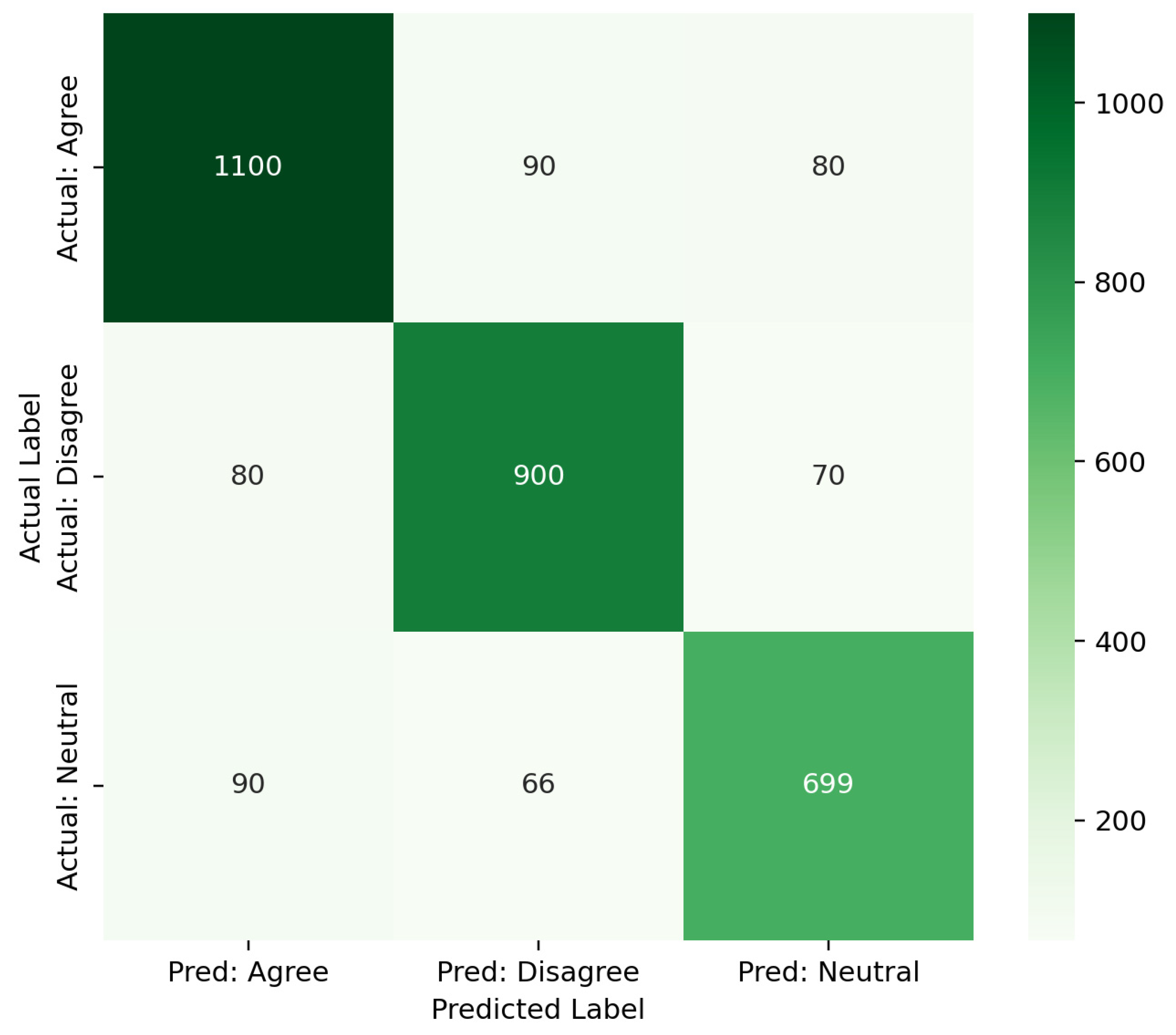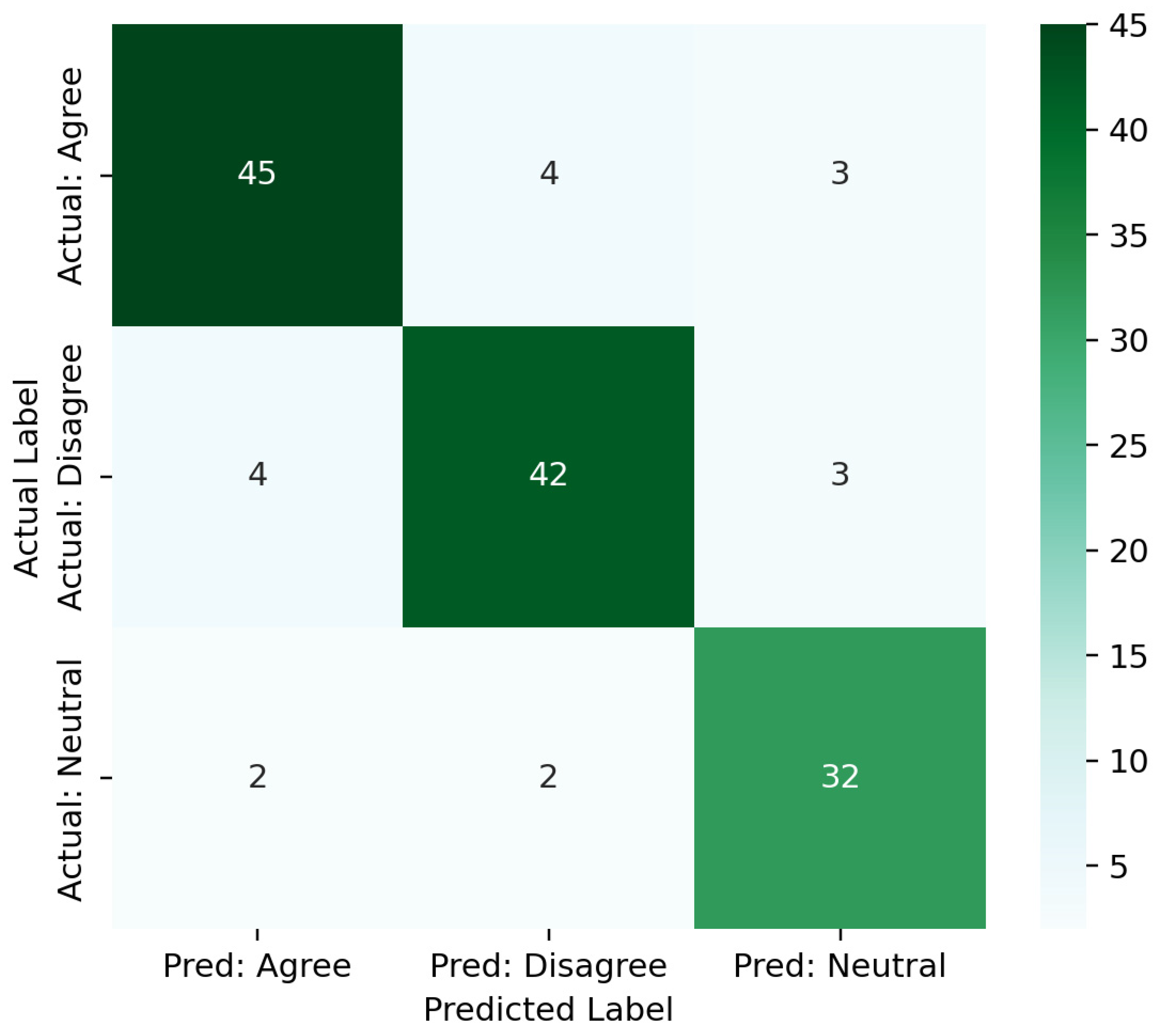 Similarly, the model achieved strong classification performance in identifying correct Disagree instances, demonstrating effective capture of explicit oppositional expressions. Misclassifications are limited and have systematic patterns rather than random noise. Most errors occur between the neutral and polarized classes, as expected, given some overlap in the semantics of weakly expressed stances and neutrality in conversational contexts. For example, there are a few instances in which the neutral cases were misclassified as Agree or Disagree, indicating borderline cases in which implicit stance cues are present but not strongly articulated. Consequently, there is minimal direct confusion between Agree and Disagree, indicating that the model maintains clear polarity separation.