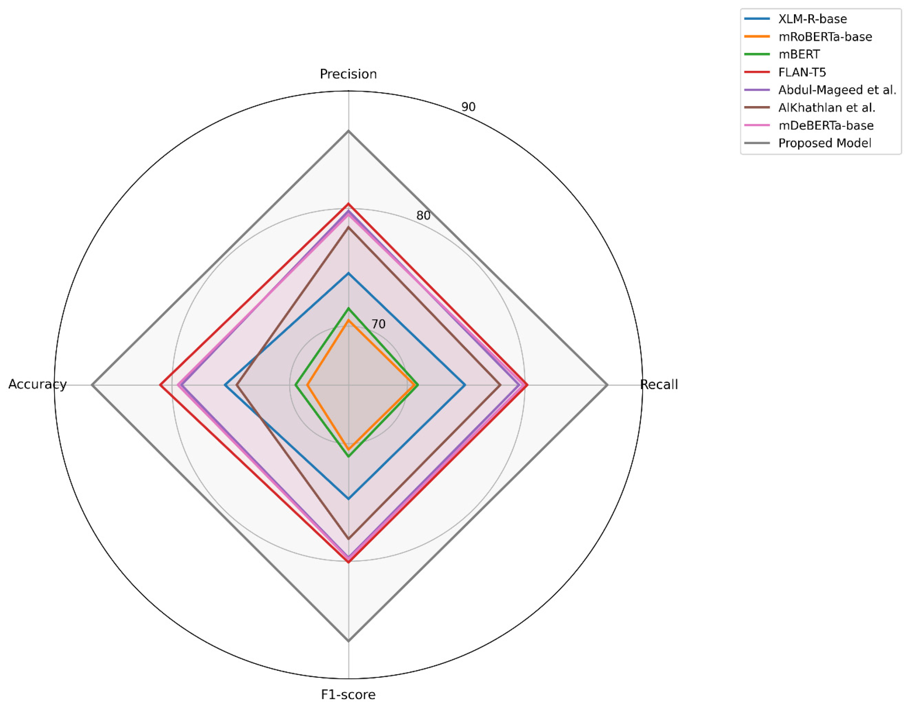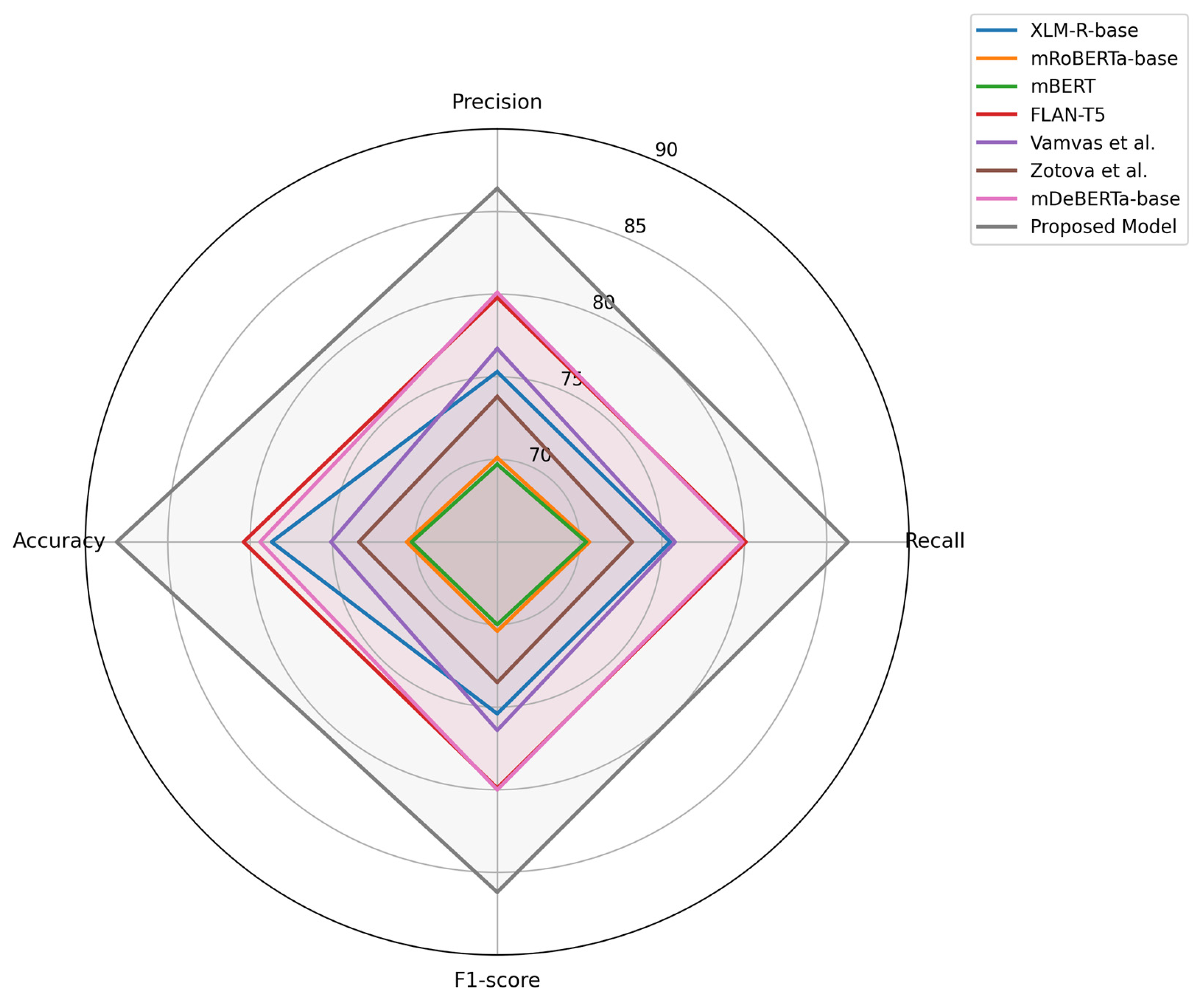 Figure 9 shows that the proposed model achieves better precision, recall, F1-score, and accuracy on the MT-CSD test set than both pre-trained multilingual transformers and state-of-the-art approaches. This performance advantage is mainly due to the target-aware formulation adopted in the proposed framework. Unlike standard pre-training models such as XLM-R, mBERT, or mRoBERTa [