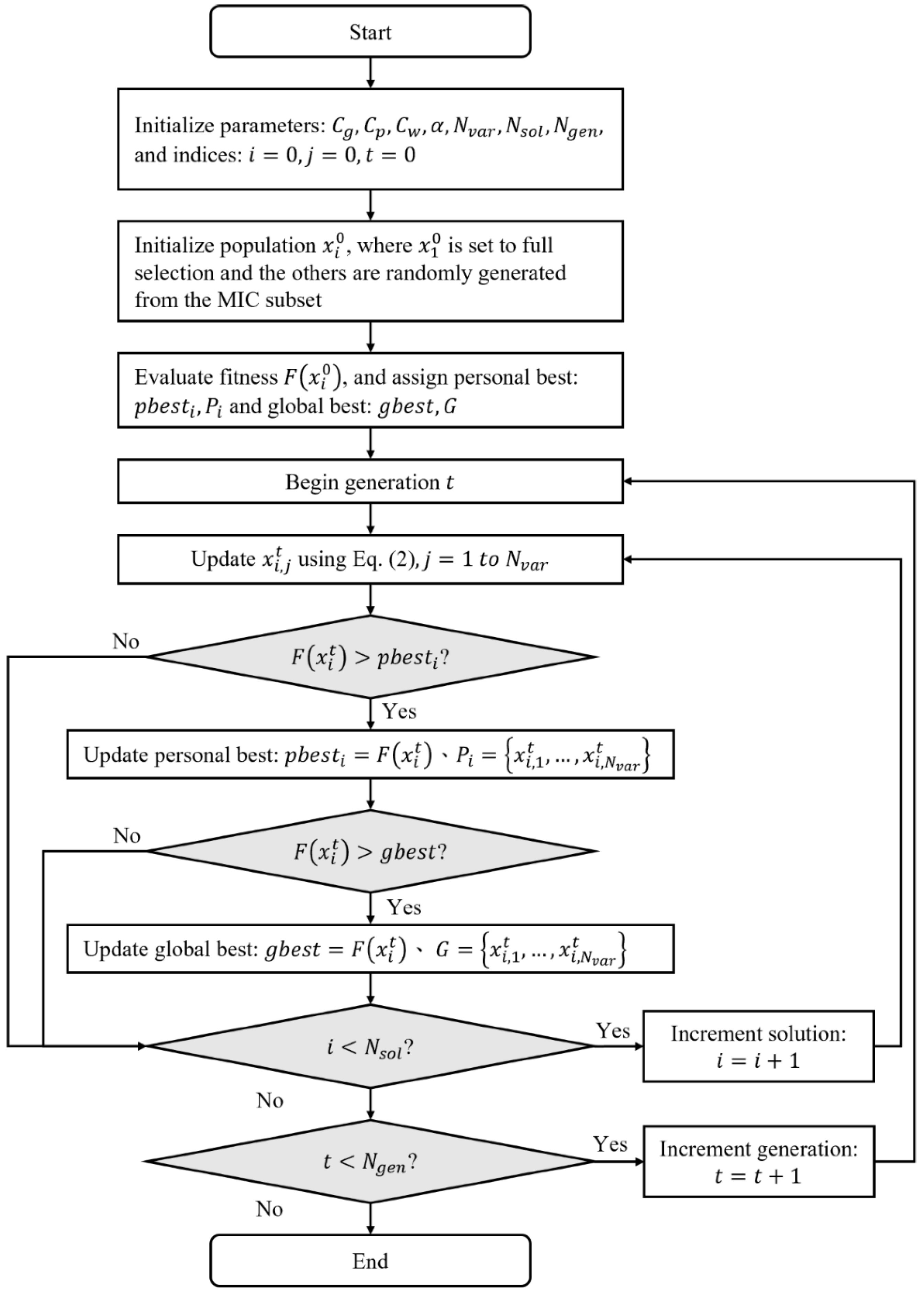 - Initialize population P with binary vectors from Ccandidate